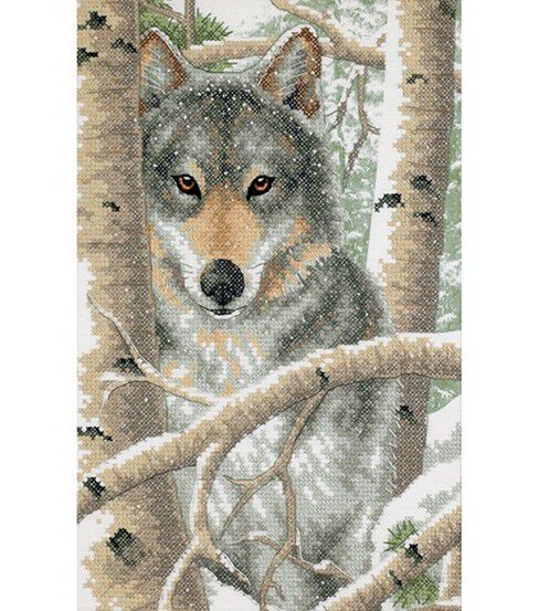 Display a beautiful cross-stitched portrait on a focal wall, when you use the Dimensions Wintry Wolf Stamped Cross Stitch Kit 9'' x 14'' to create it. The stamped cross stitch kit features a visually delightful stamped image of a lone wolf in a wintry forest scene. This kit includes white sailcloth, stranded cotton threads, needle and easy instructions. Finished size of the design measures 9 x 14 inches.