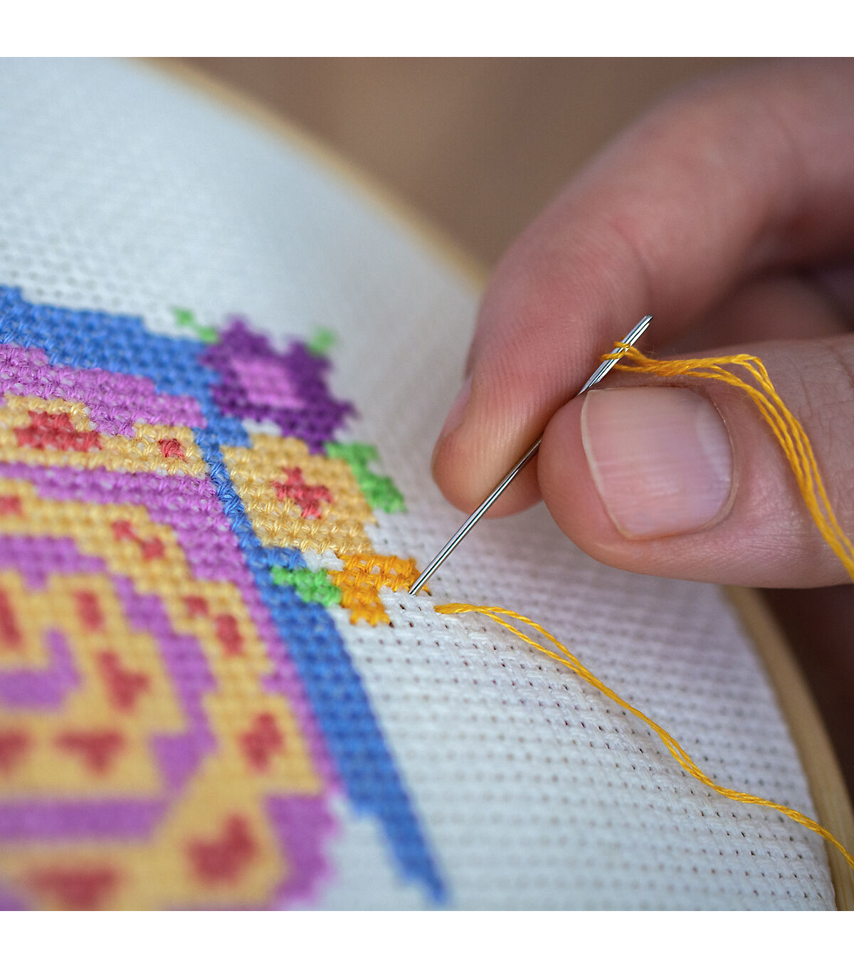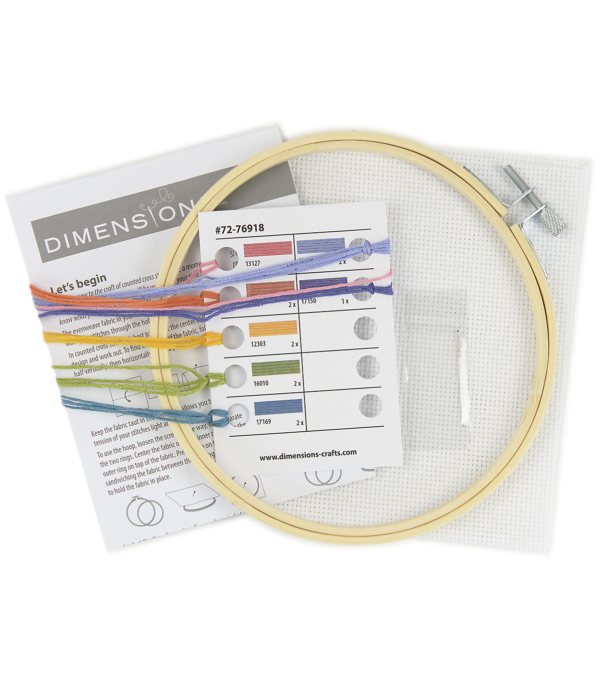 - Includes presorted thread, 14 count white Aida, 6-inch bamboo hoop, needle and instructions