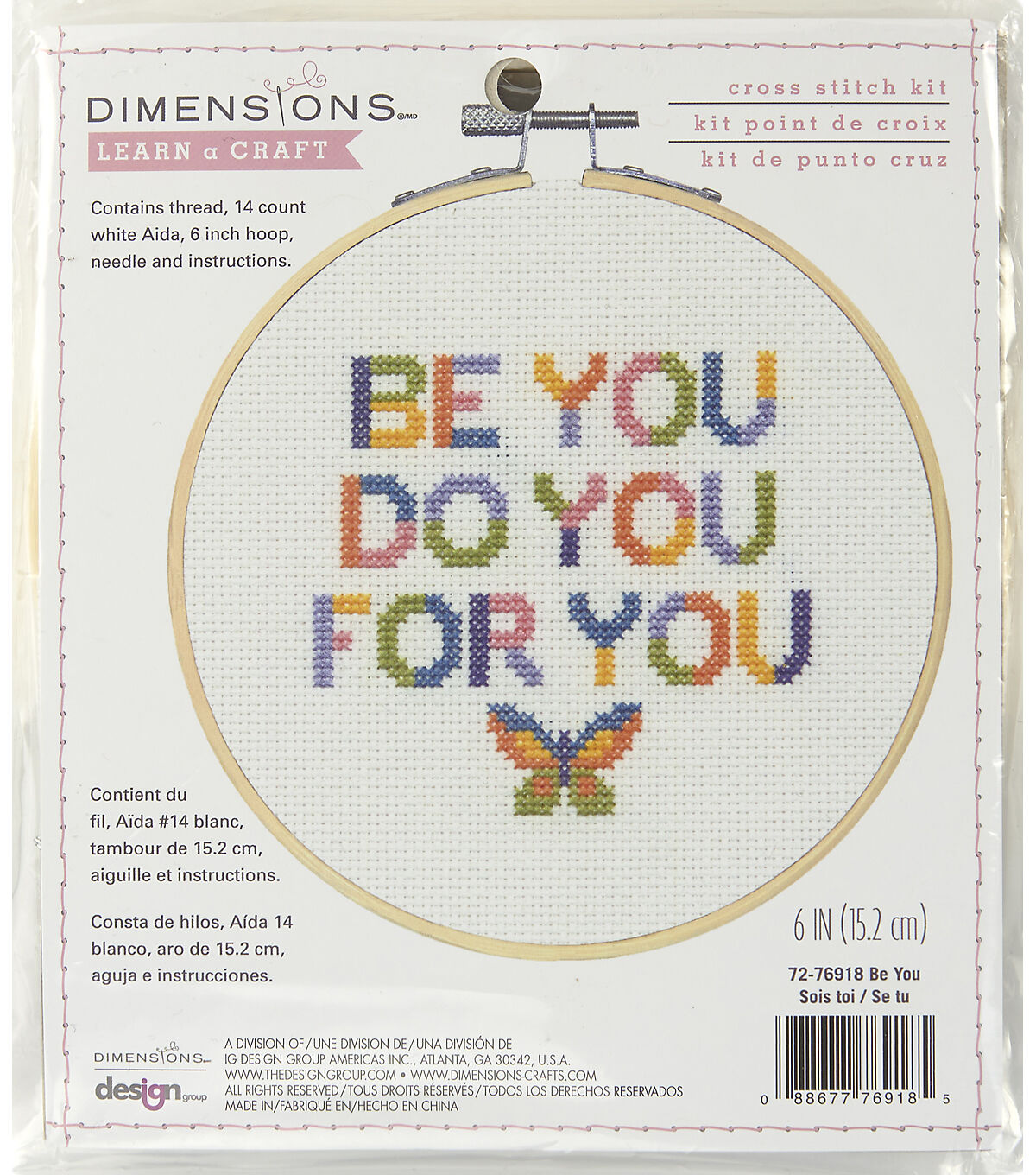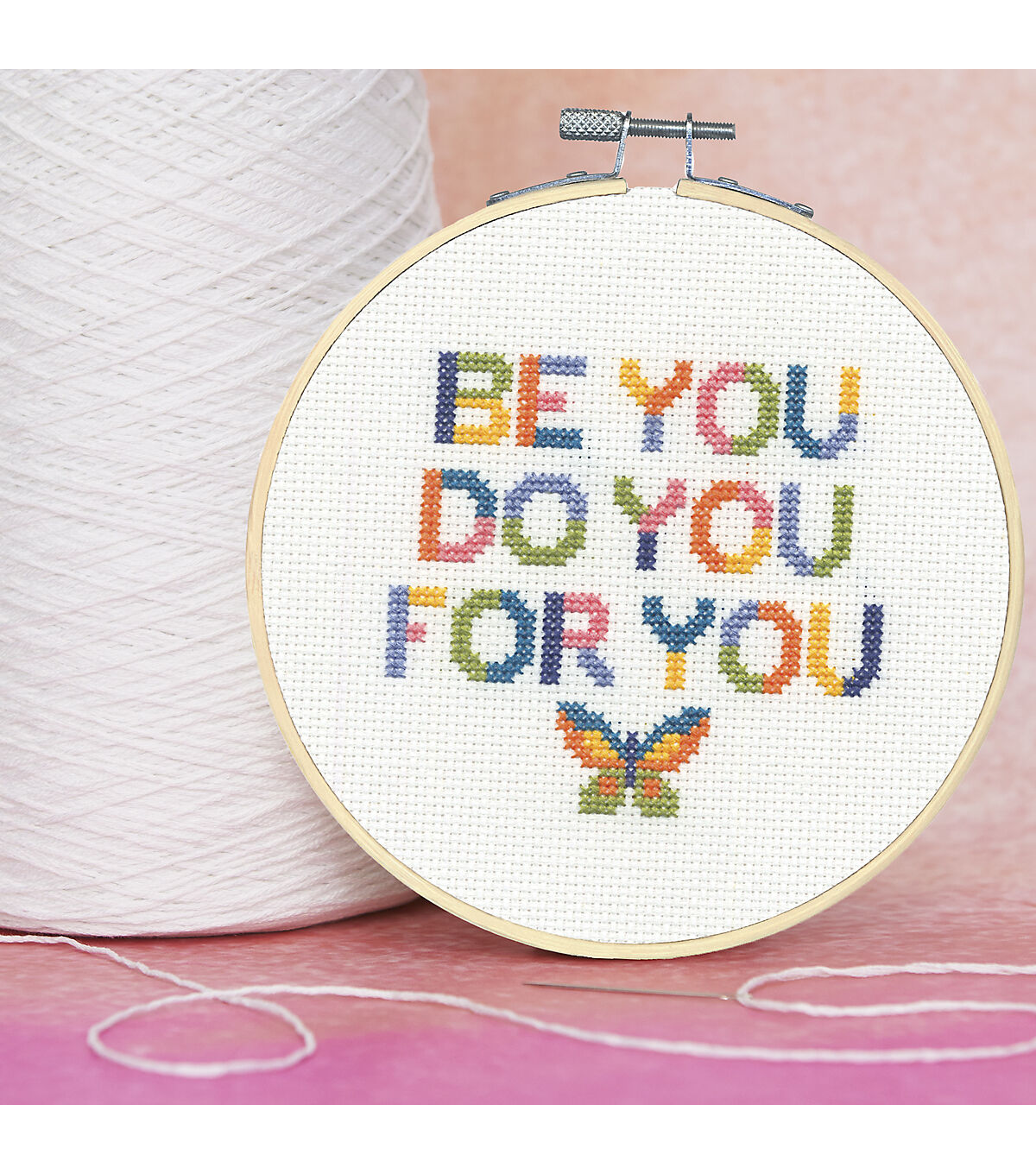 This inspirational cross stitch design from Dimensions is fun and easy to stitch! Worked with colorful shades of thread, it's perfect for YOU or for gifting to a special friend. Finished size: 6" diameter. Kit contains presorted thread, 14 count white Aida, 6-inch bamboo hoop, needle, and instructions.