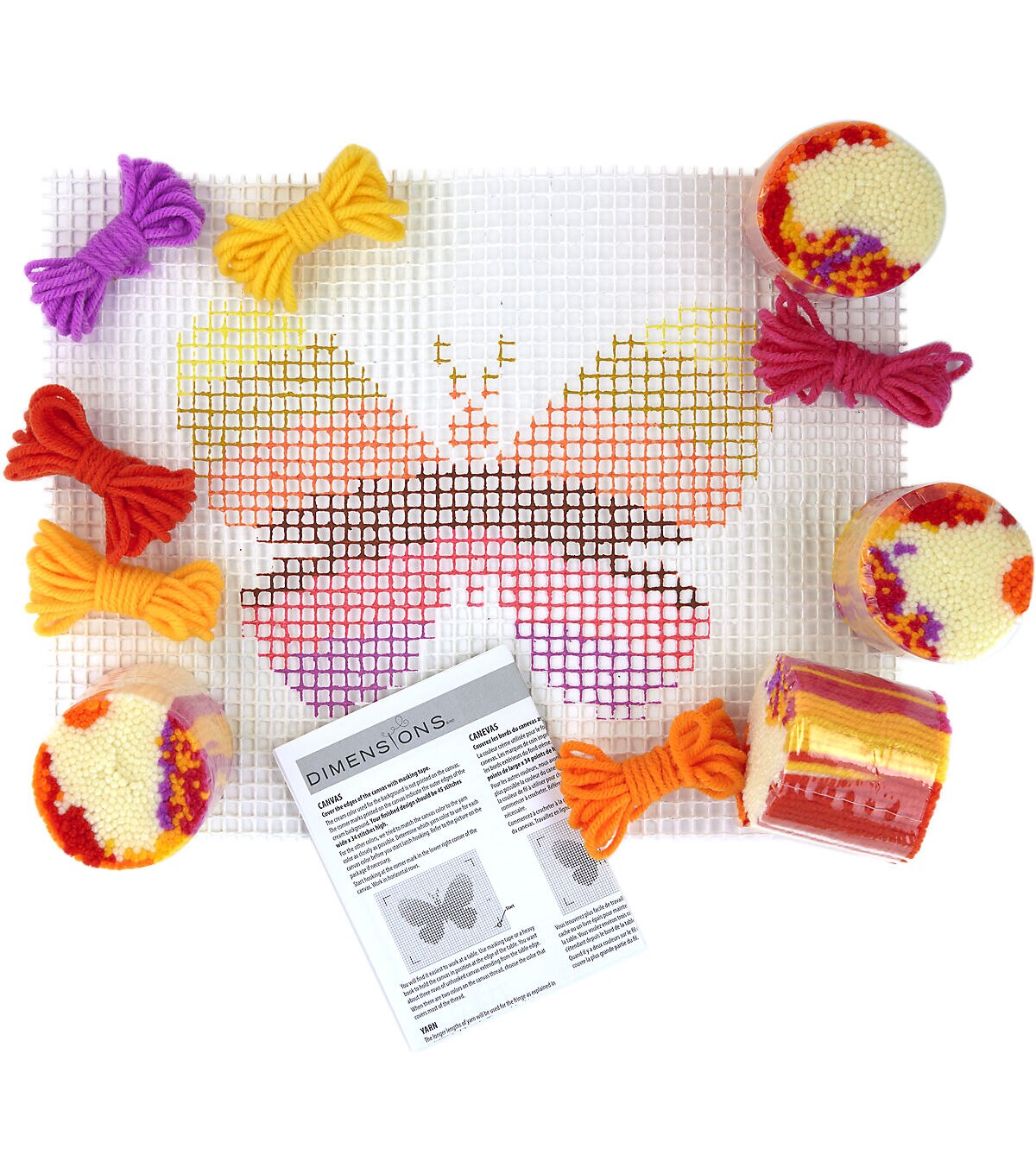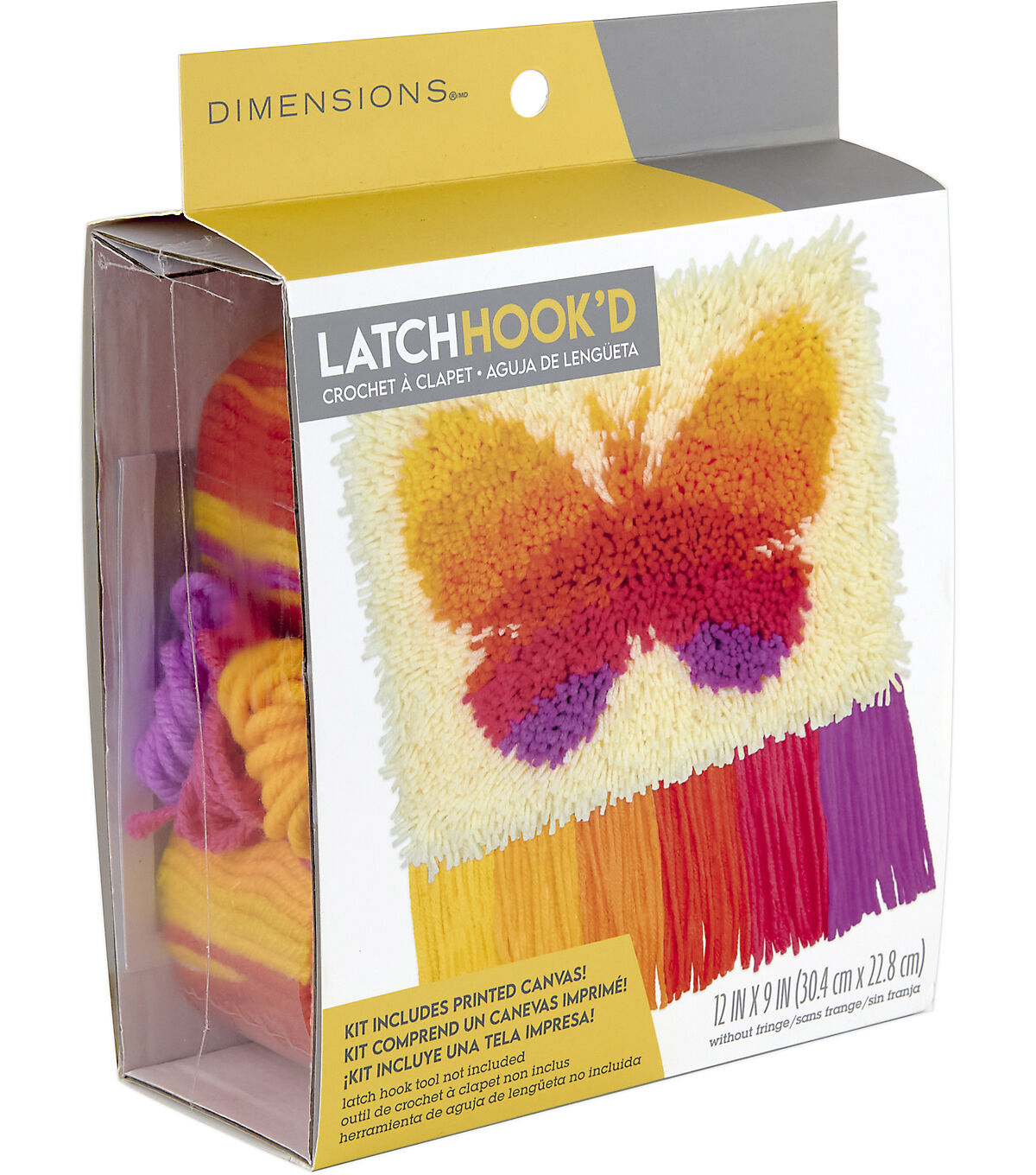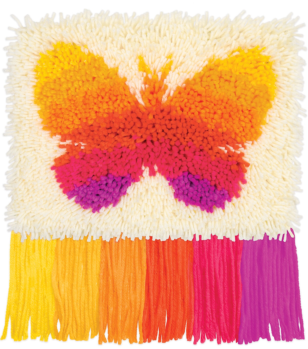 A vibrant butterfly is featured on this uplifting latch hook design by Dimensions. Simply match the yarn color to the printed color on the canvas. It's so easy to do, and once you get going, you'll be hooked on this fun craft! Finished size: 12" x 9" plus fringe.