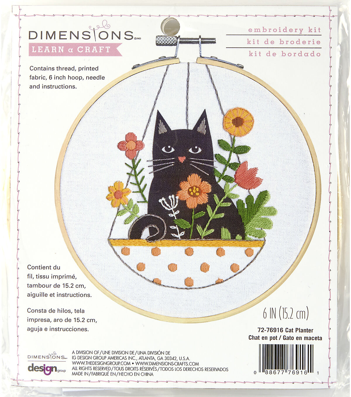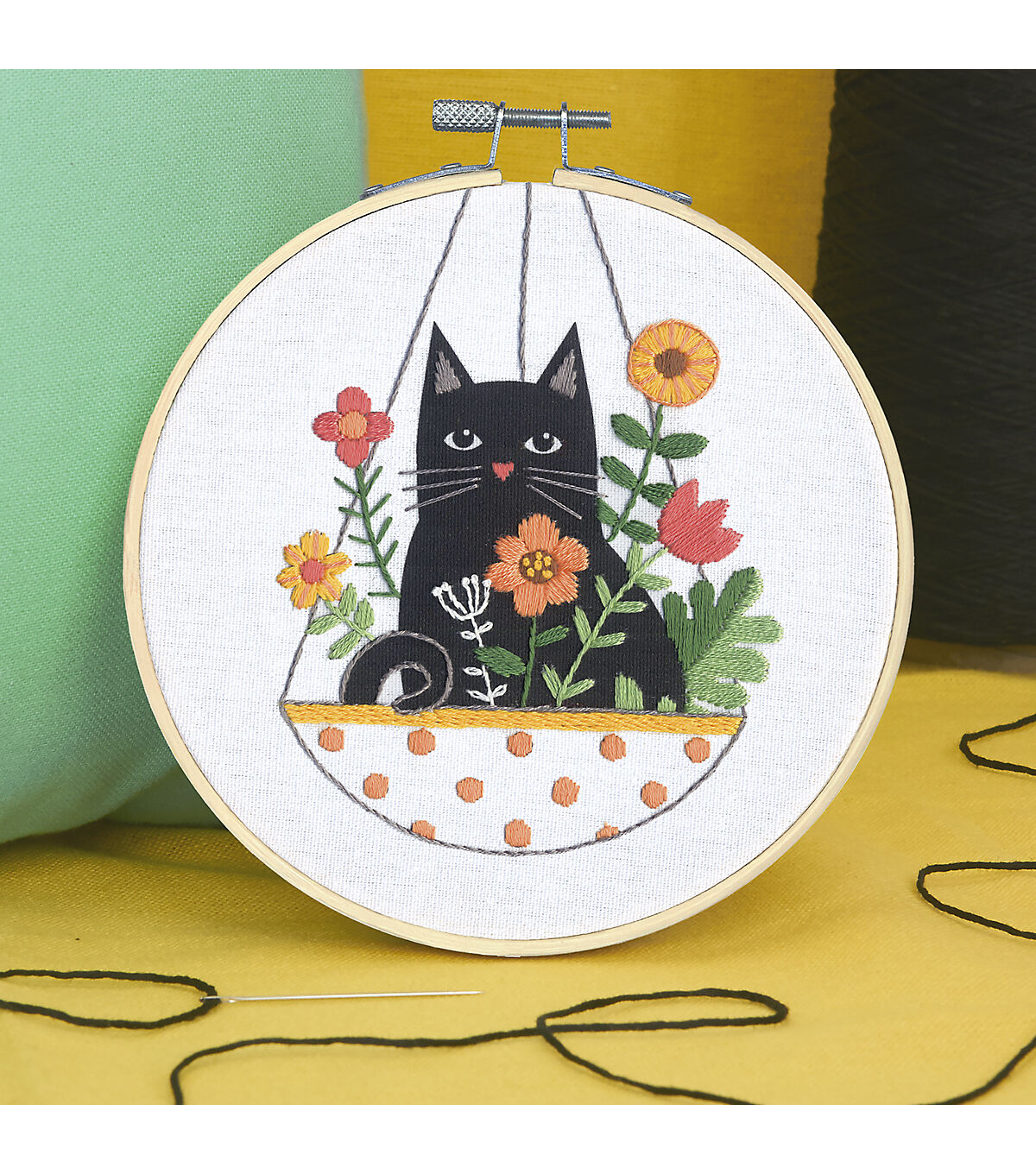 Uh-oh, Mom's not going to be happy that this curious kitty has taken up residence in her hanging plant. But who can resist that sweet face! This charming embroidery design from Dimensions is quick and easy to stitch. Finished size: 6" diameter. Kit contains presorted thread, printed fabric, 6-inch bamboo hoop, needle, and instructions.