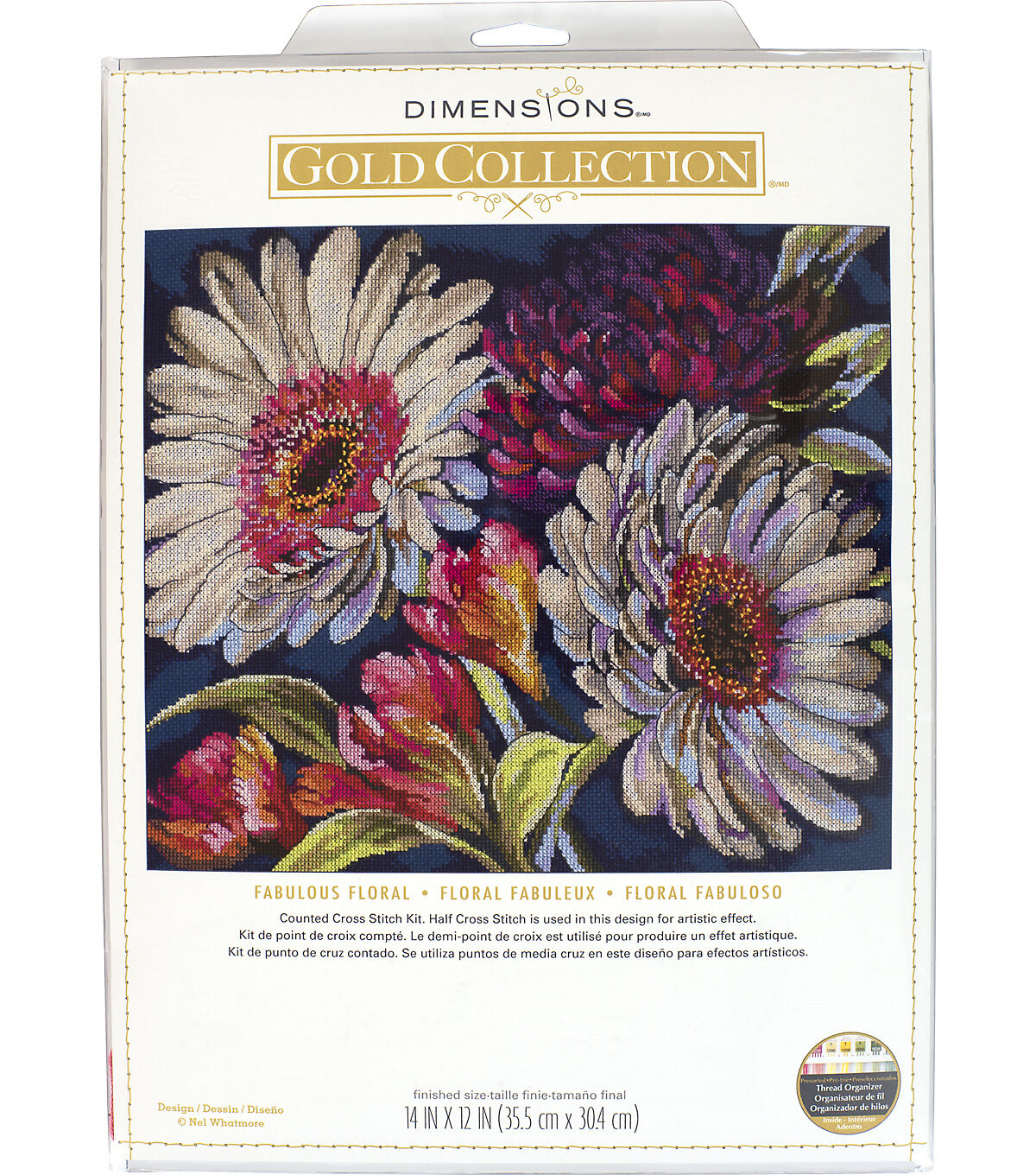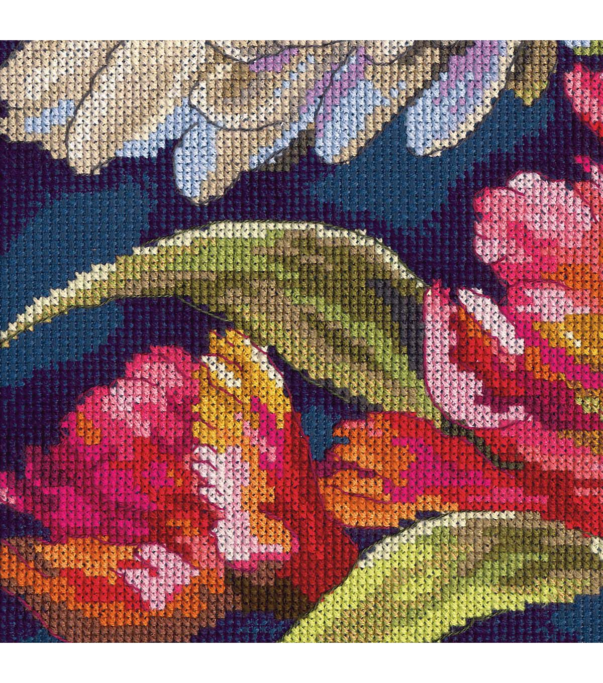 Nel Whatmore's artwork of bold and bright blooms is brilliantly interpreted into counted cross stitch on Fabulous Floral by Dimensions. This Gold Collection design will make a stunning display in any room of your home. Finished size: 14" x 12". © Nel Whatmore. Kit contains presorted thread, 14 count navy Aida, needles, and instructions.