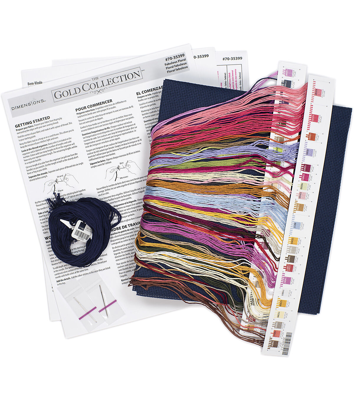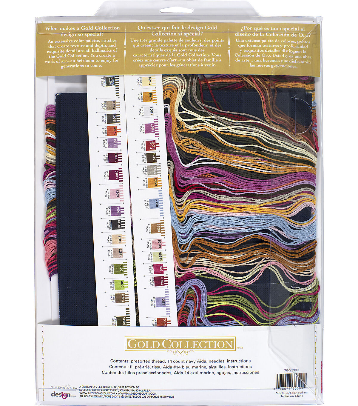 - Includes presorted thread, 14 count navy Aida, needles, and instructions