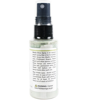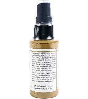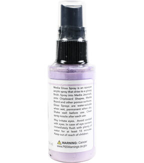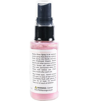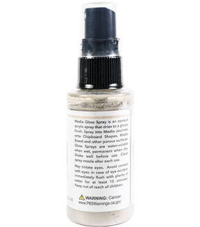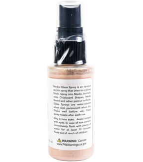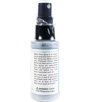 An opaque acrylic spray that dries to a glossy finish. Spray into Media Journals, onto Chipboard Shapes, Media Board and other porous surfaces. This package contains 1.9oz of media gloss spray. Conforms to ASTM D 4236. Comes in a variety of colors. Each sold separately. Made in USA. WARNING: This product can expose you to chemicals which are known to the state of California to cause cancer. For More information go to www.P65Warnings.ca.gov.