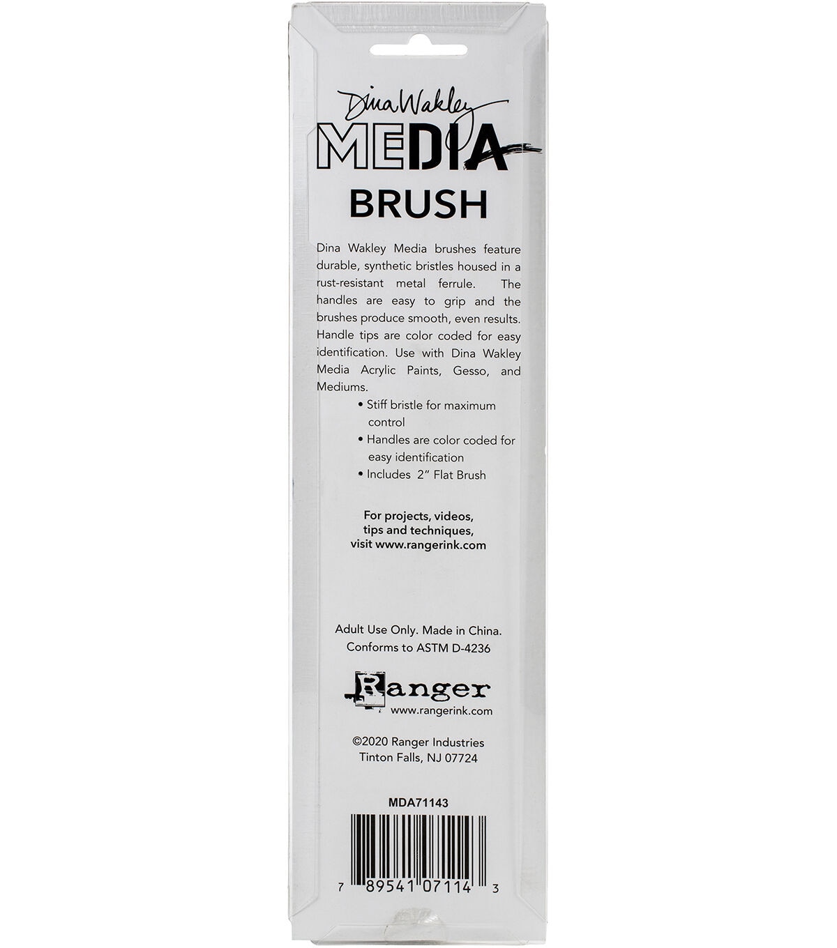 Dina Wakley Media brushes feature durable, synthetic bristles housed in a rust-resistant metal ferrule. The handles are easy to grip and the brushes produce smooth, even results. Use with acrylic paints, gesso and mediums. This package contains one 1.75x9.5 inch brush. Conforms to ASTM D 4236. Imported.