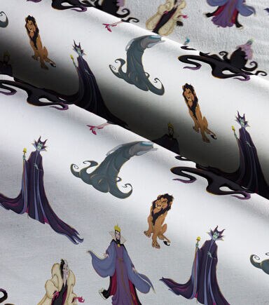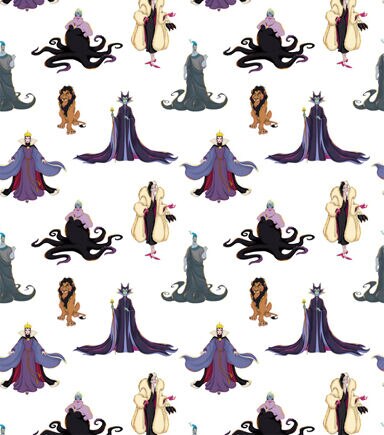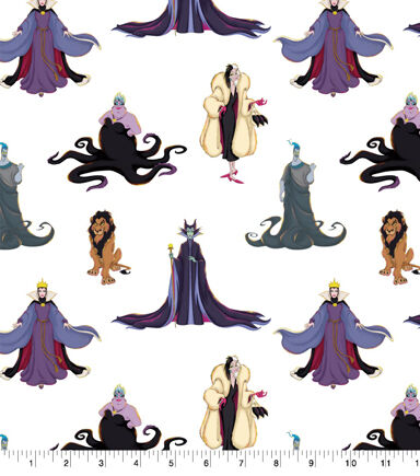 This Disney Villains Packed includes Ursula, Maleficent, Cruella de Vil, Scar and Hades on a white background. This fabric would be super great to use in crafting anything from pillows to a throw blanket. This is 100% Cotton and machine washable.
