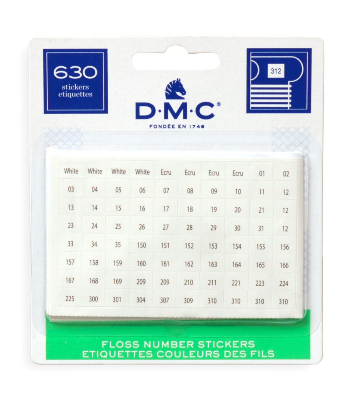 A set of small, pre-printed self-stick labels that can be adhered to DMC or other brand floss bobbins. Pack contains 500 labels, printed with all 464 solid and variegated color numbers, plus extra labels for popular shades, and 20 blank labels.