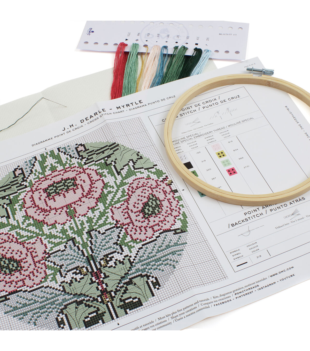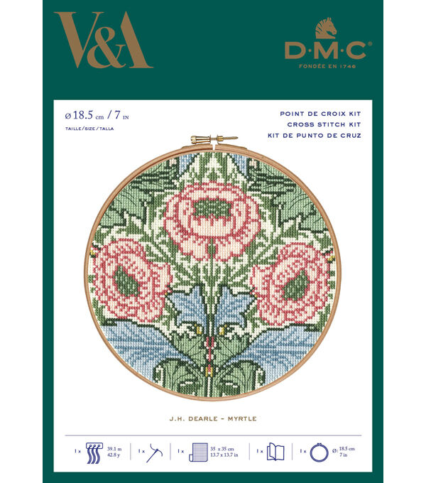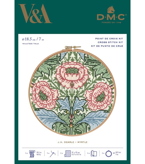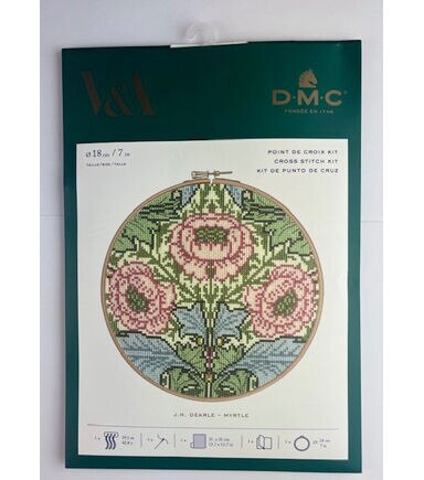 - Kit includes: DMC Embroidery Floss on organizer, Embroidery needle, Detailed instructions, Ecru 14 ct Aida, 7-inch wood hoop