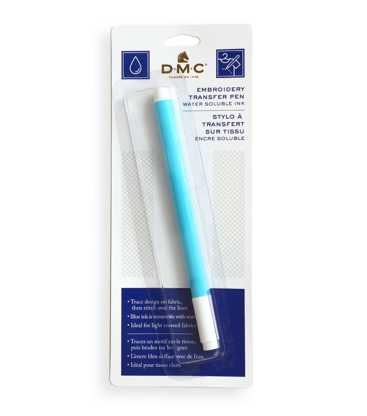 Design various fashion apparel or home decor accessories with the DMC Embroidery Transfer Pen. You can transfer the beautiful embroidery designs on medium or light colored fabrics and stitch over it to create embroidered decor accents. The blue ink of the pen is non-permanent and can be removed with water or a damp cloth before ironing. This package includes one embroidery transfer pen.