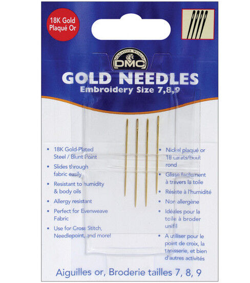 DMC-Gold Embroidery Hand Needles come in sizes 7, 8, and 9. These superior quality needles are resistant to humidity, body oils and rust. Perfect for cross-stitch, needlepoint, and counted thread- work. Four needles per package. Made in France.