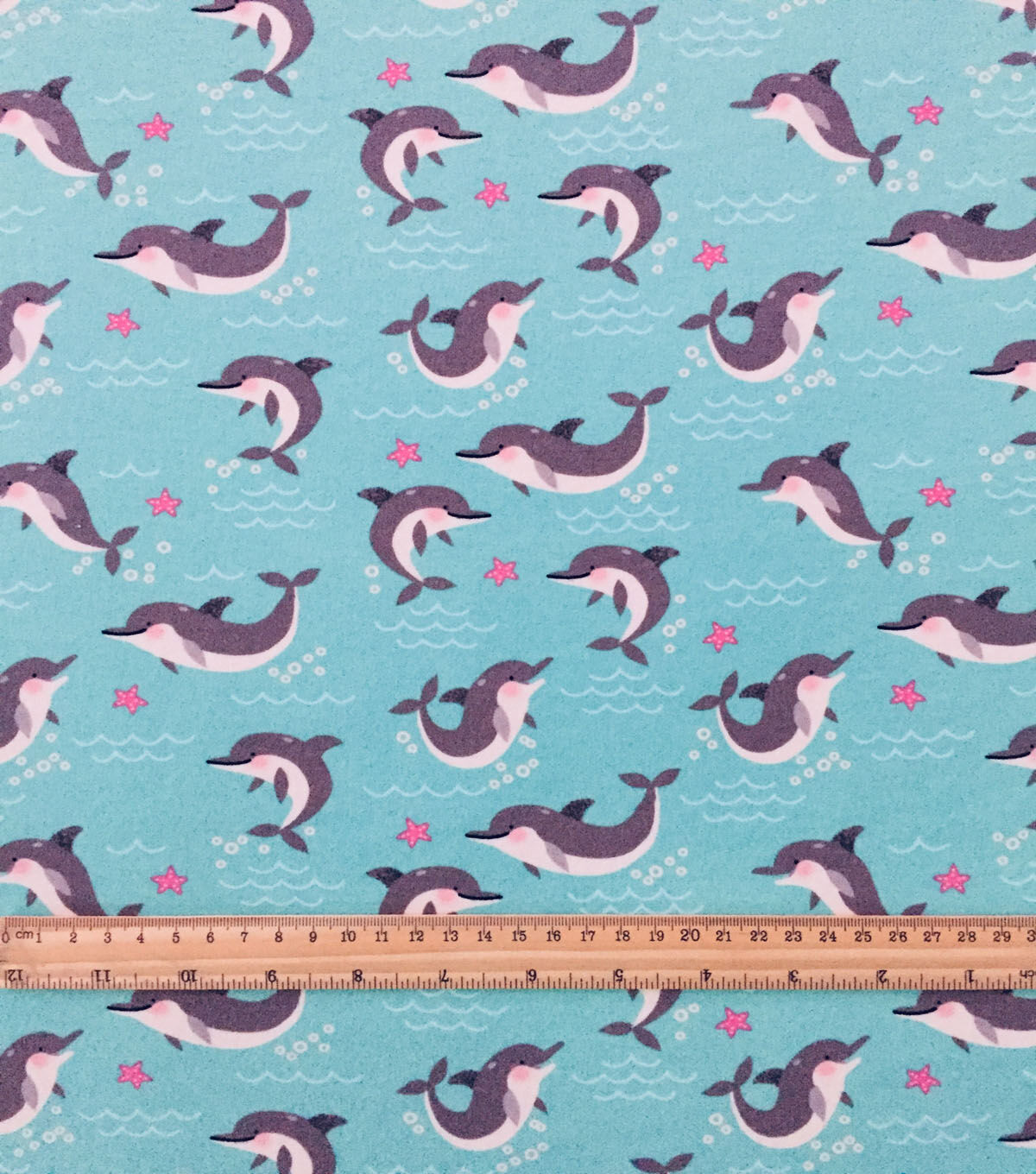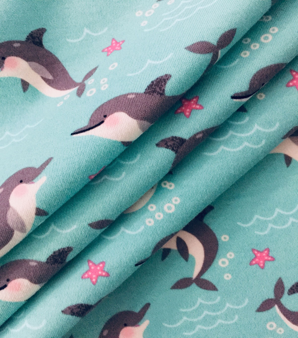 Experience the Beauty of the Ocean with Dolphins on Blue Cotton Interlock Knit Fabric by POP!
