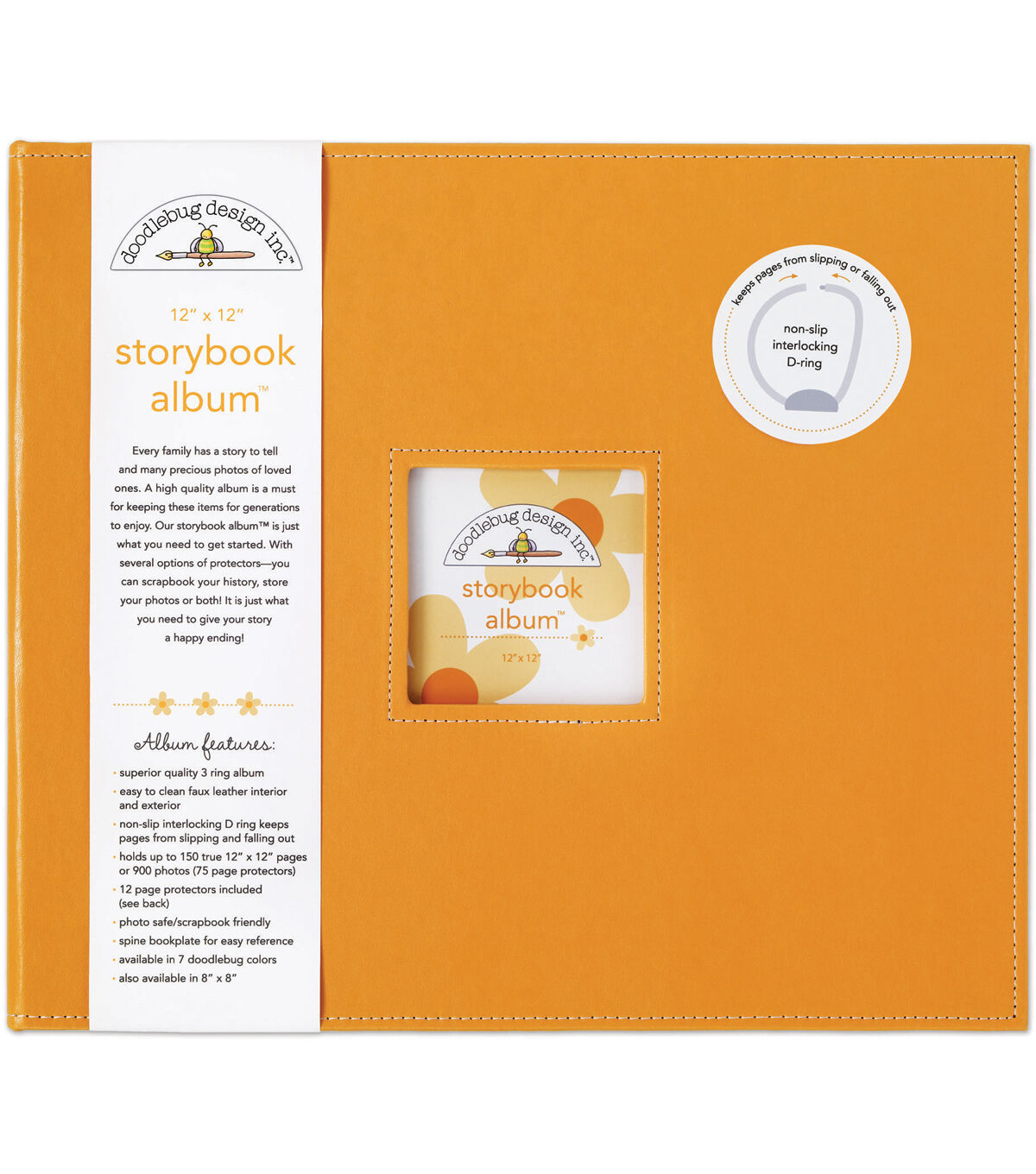 The Doodlebug Storybook D-ring Album - Tangerine will be perfect to store photos, postcards, greeting cards and more. This pack includes a three-ring photo-safe album that is designed with an easy-to-clean faux leather interior and exterior and 12 page protectors. The non-slip interlocking D-ring prevents pages from slipping and falling out. It can hold up to 150 true 12 x 12-inch pages or 900 photos. Also includes a photo-safe, scrapbook-friendly, spine bookplate label for easy reference.