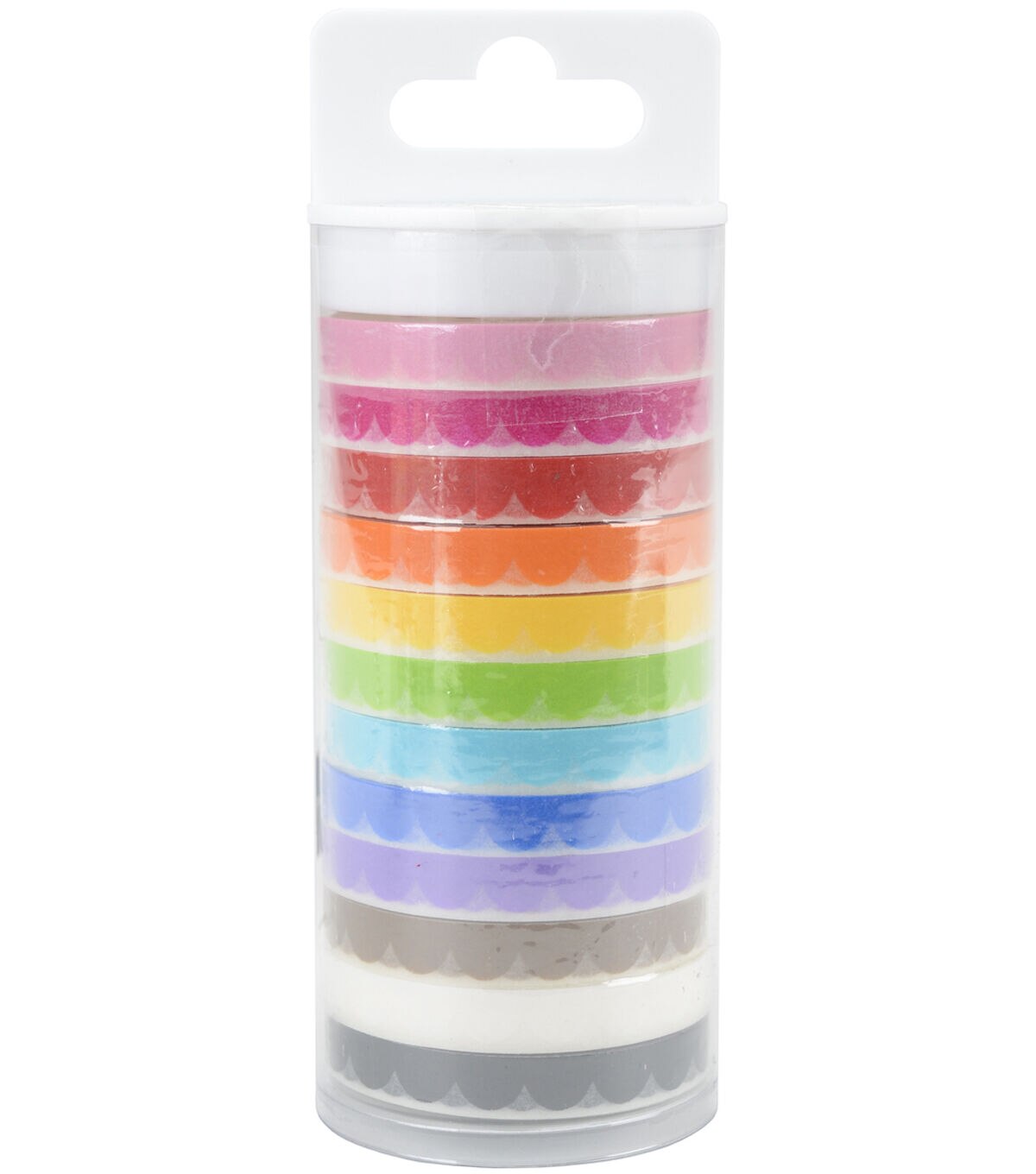 Embellish handmade cards, paper crafts, home decor projects and more with the Doodlebug Monochromatic Washi Tapes - Scallop. Sporting vibrant colors and a scallop pattern, these decorative tapes will add flair to your creative projects. You can use them to make borders, decorate journal covers, enhance party decor accents and much more. This pack contains 12 washi tape rolls, each measuring 12 yards in length. Available in a variety of patterns, each sold separately.