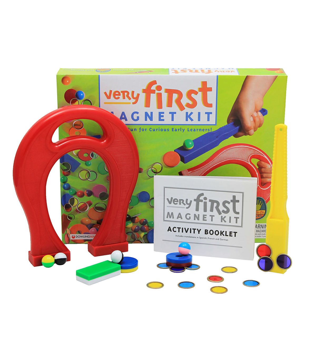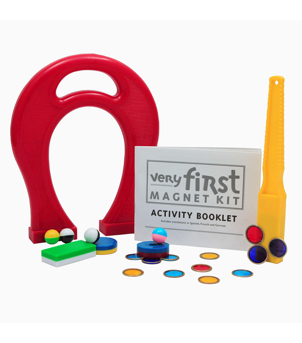 Inspires next generation scientists! Amazes early learners as they observe and investigate magnetism for the first time. Explore magnetic versus non-magnetic objects, play magnet games and discover if a magnetic force travels through water, cardboard or the sides of a glass jar. Very First Magnet Kit includes: 1 magnet wand, 1 giant horseshoe magnet, 10 magnet marbles, 20 counting chips, 3 ring magnets, 2 plastic-encased button magnets, 1 plastic-encased block magnet, and a complete activity booklet with translations in German, French and Spanish.