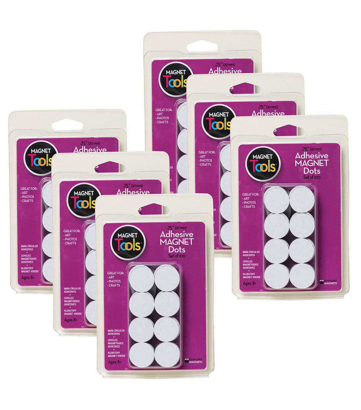 Display student work or post announcements on your whiteboard! Feature strong adhesive backs and light magnet holding power. Hang paper or create lightweight craft projects. Includes 100- 3/4" adhesive-backed magnet dots. 100 dots per pack, 6 packs, 600 dots total