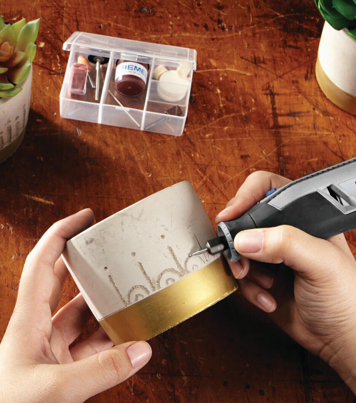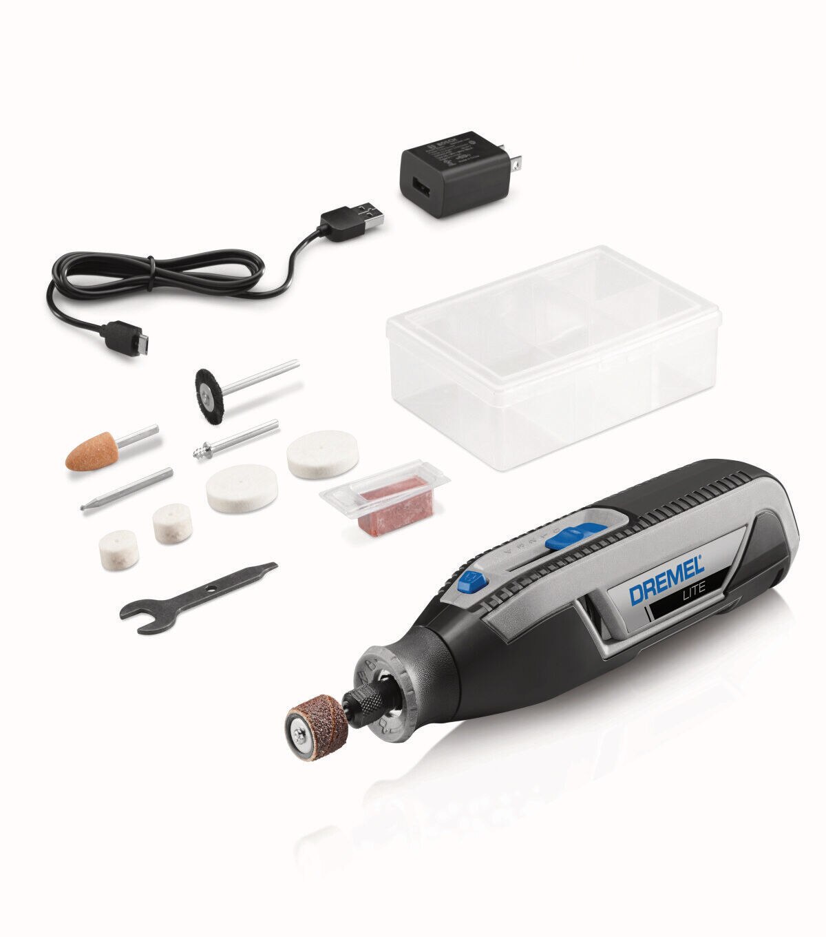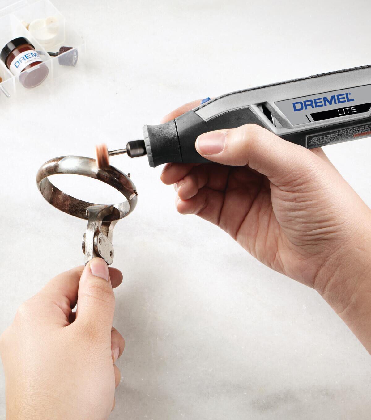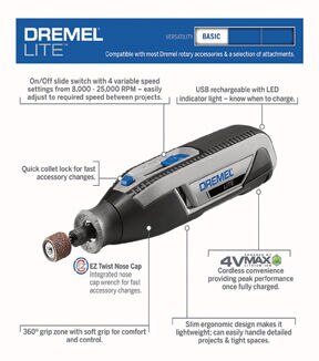 Carve, engrave, grind, sharpen, clean, polish and sand with a single rotary tool. Designed for beginners in mind, the Dremel Lite is a user-friendly solution for a wide range of projects. Whether you are completing the light finishing touches, needing to fit into a tight spot, or completing the most precise tasks– the versatility of the Dremel Lite allows you to respond to projects quicker. The cordless rotary tool features 8,000-25,000 RPM of rechargeable battery powered by an efficient USB system that holds its charge. The four different speed settings offer better control for different applications, plus the lightweight design and soft grip make it easy and comfortable to use. The Lite is compatible with Dremel’s entire line of rotary accessories, making it a must-have for busy homeowners, crafters, and new DIYers.