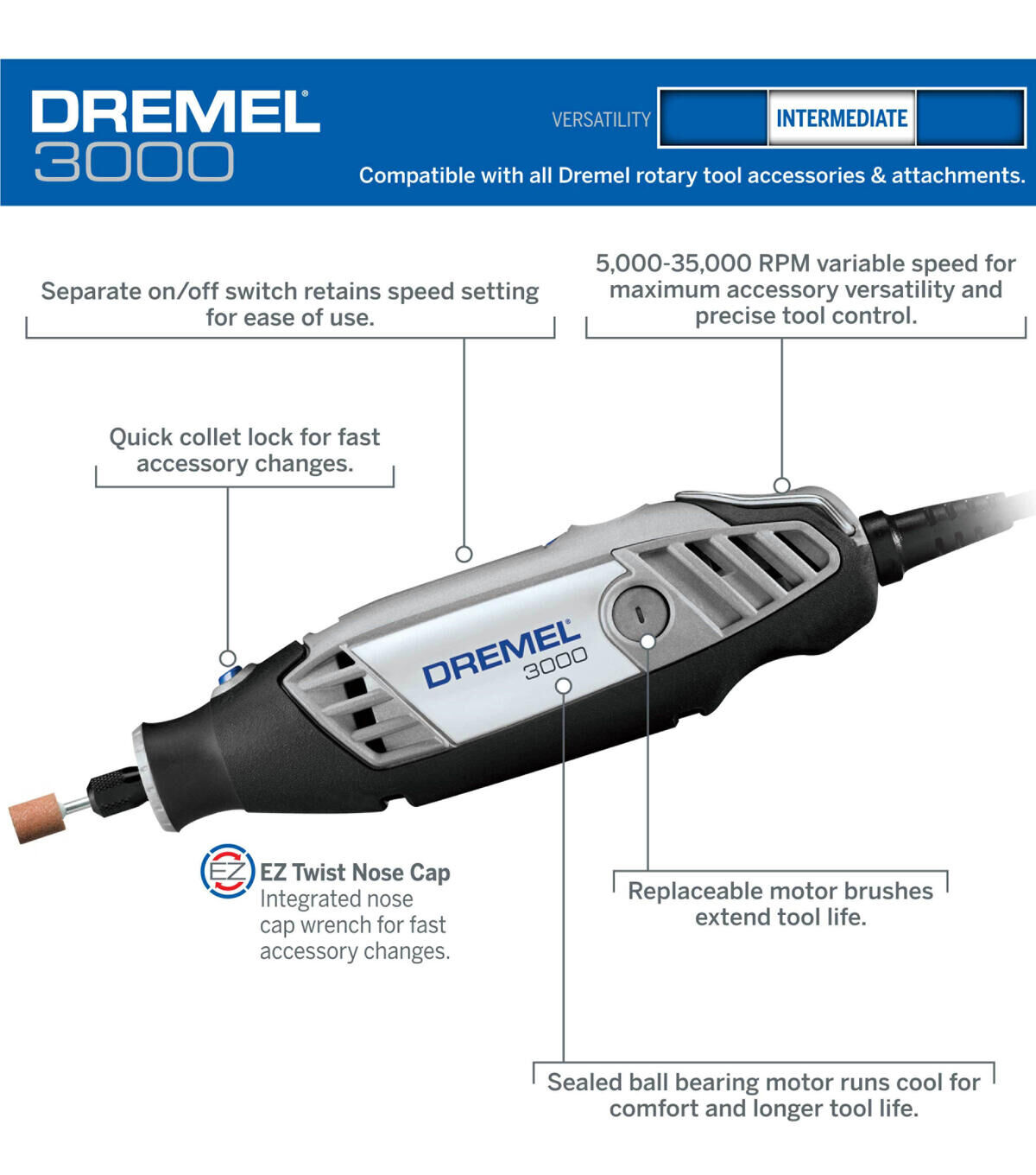 - Can be used with all Dremel rotary tool accessories and most attachments