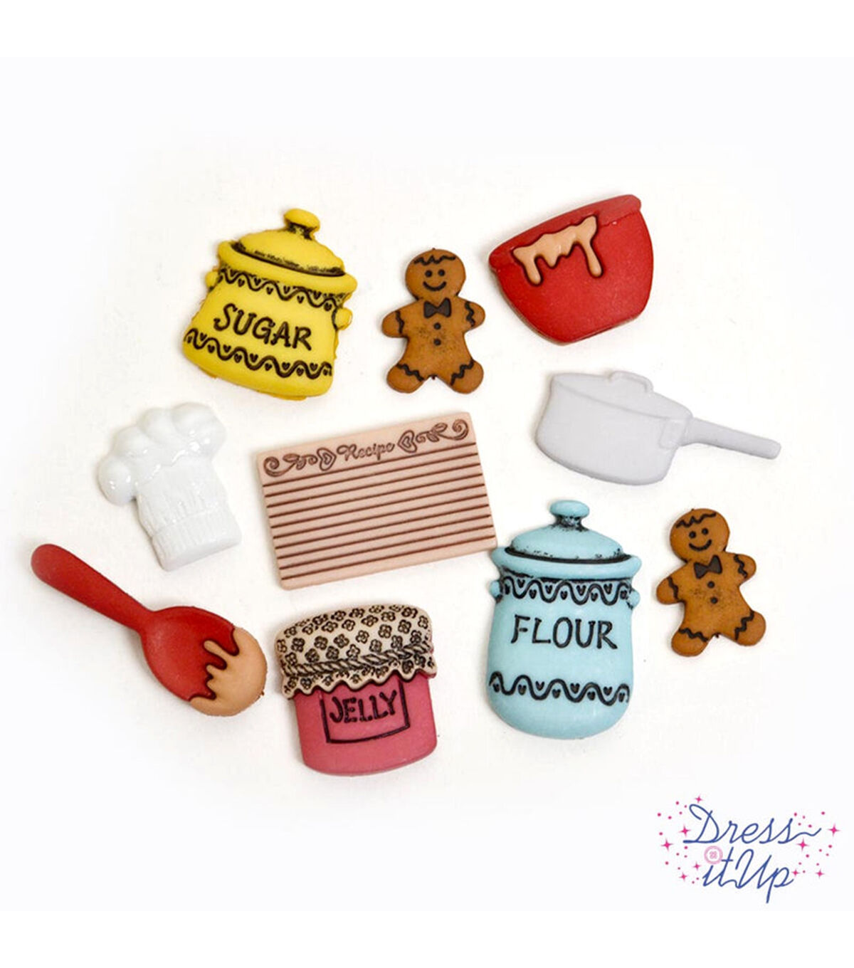 The Dress It Up In the Kitchen Button Embellishments will be perfect to decorate a DIY apron, mittens or kitchen towels. These lovely button embellishments are shaped like canisters, a mason jar, a measuring spoon, a recipe list, a cutting board and more. They sport lovely colors and will also make a great addition to tote bags.