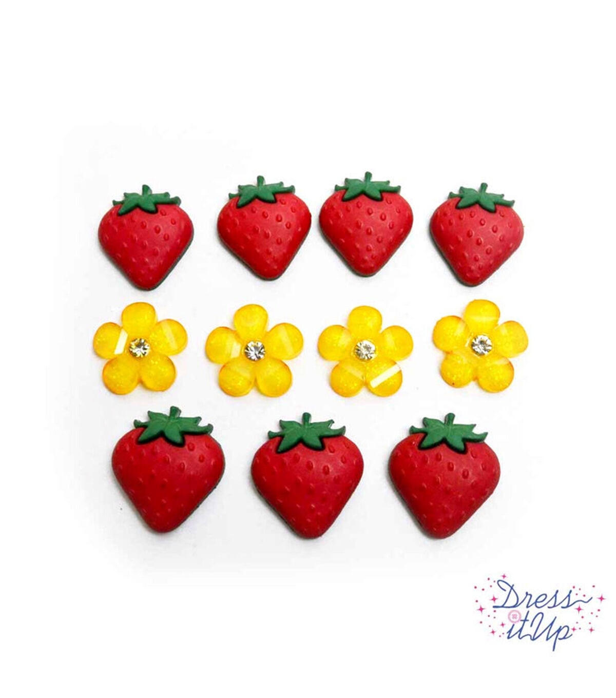 Your kids will love wearing the outfits designed with the Dress It Up Strawberries & Flowers Button Embellishments. This pack includes buttons shaped like flowers sporting a yellow hue and adorned with rhinestones and strawberries displaying red and green shades. These buttons will also be great to accentuate garden-themed embroidery projects or hair accessories.