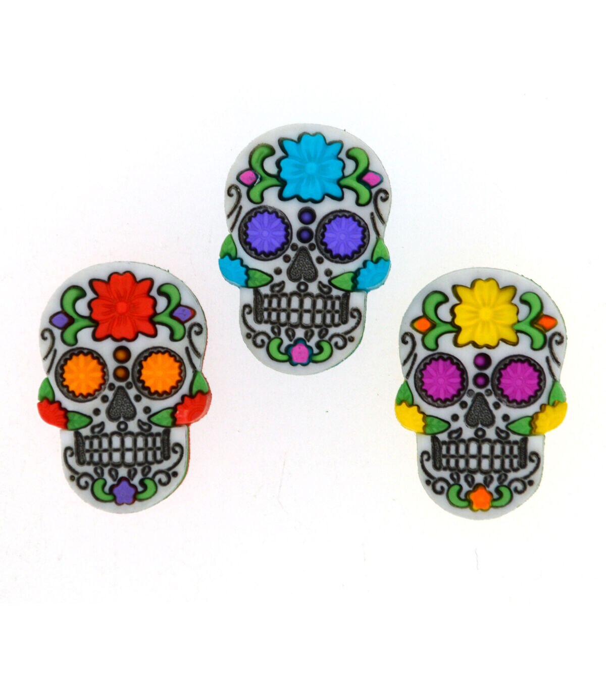 The Dress It Up Button Embellishments Halloween Collection Sugar Skulls will make a great addition to your Halloween craft supplies. This pack includes three buttons that resemble sugar skulls. You can use them to accentuate DIY photo frames or treat bags or team them with other Halloween-themed embellishments to trim tablecloths and table runners.Brand: Dress It Up Collection: Novelty Buttons Theme: Sugar Skulls Includes three buttons Content: Plastic This product comes in an assorted variety of themes - item will be picked at random
