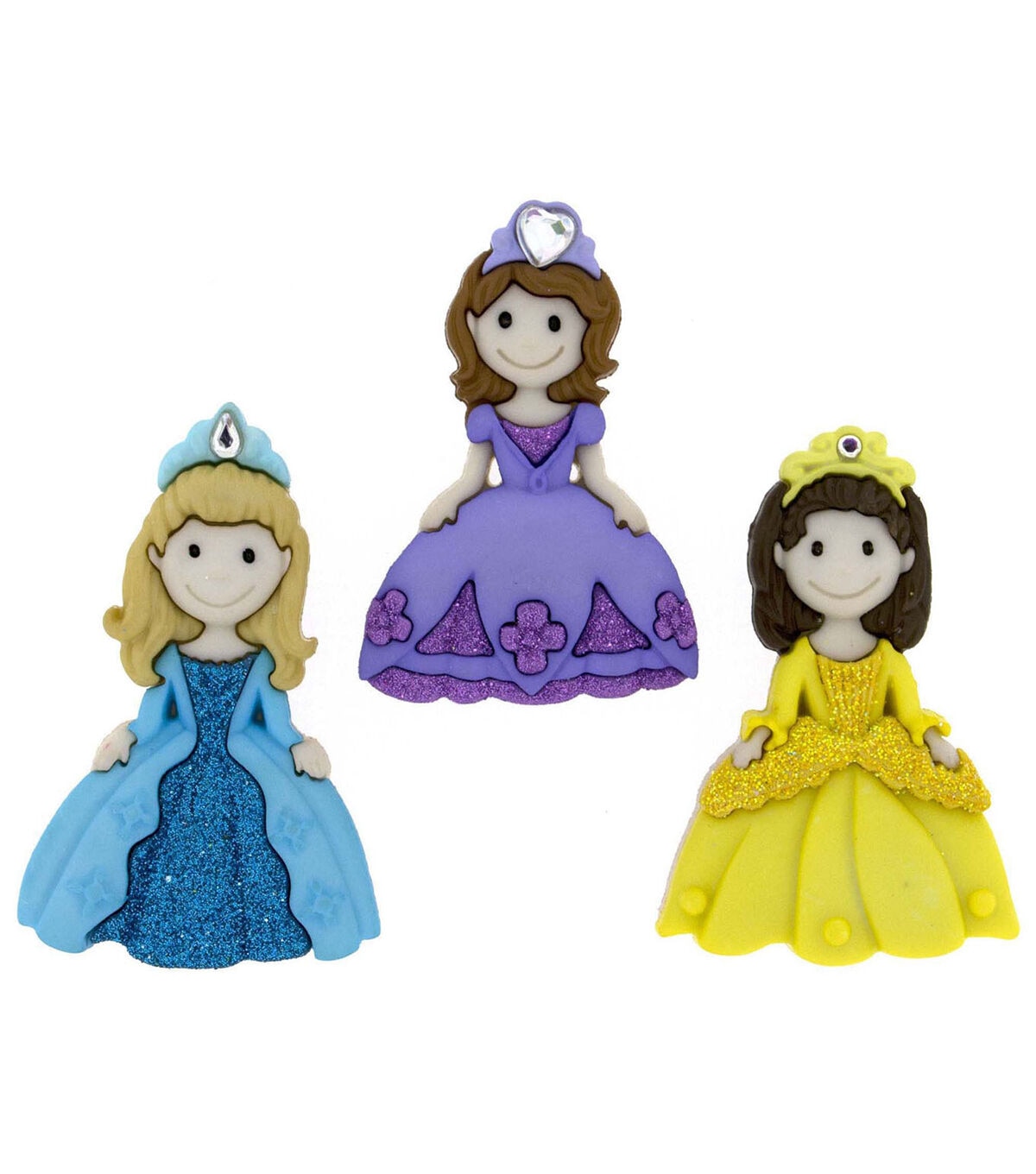 The Dress It Up Button Embellishments Little Girl Collection Pretty Princesses are perfect to prettify your sewing projects. They resemble smiling princesses wearing lovely gowns and tiaras in bright hues. These shank buttons are adorned with glitter for added visual appeal. You can use them to decorate a DIY dress or gown that you stitched for your little girl.