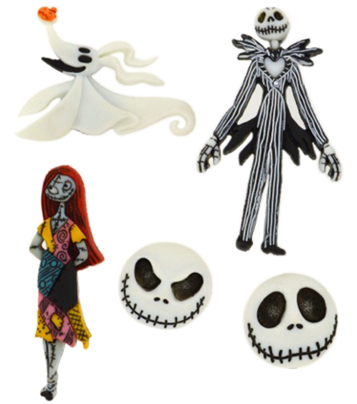 This is Halloween! Create spook-tacular Halloween decor, needlework, wood crafts, paper crafts, and more with this Disney inspired craft embellishments. Each pack includes two Jack heads, one full body Jack, one full body Sally, and one Zero.