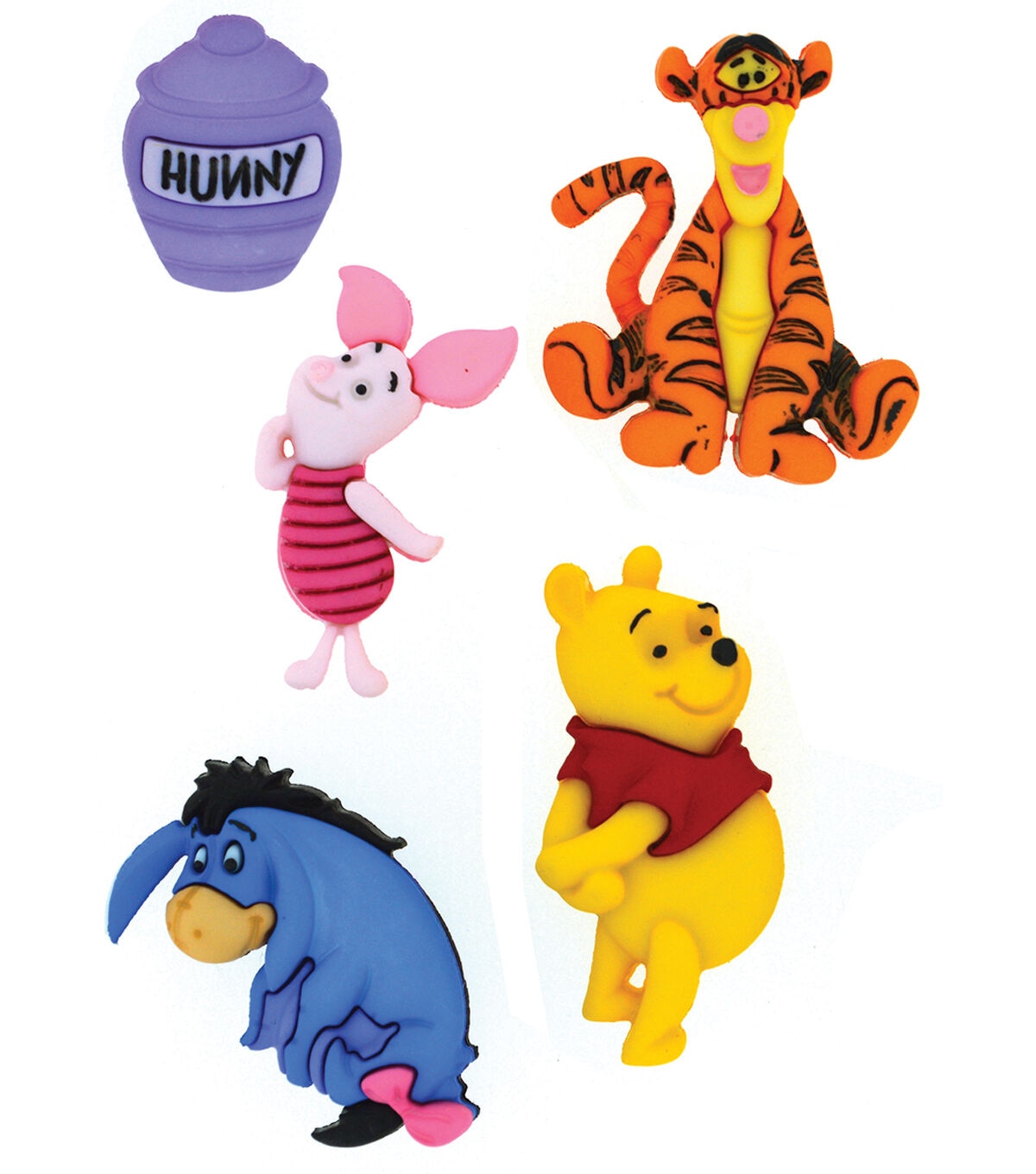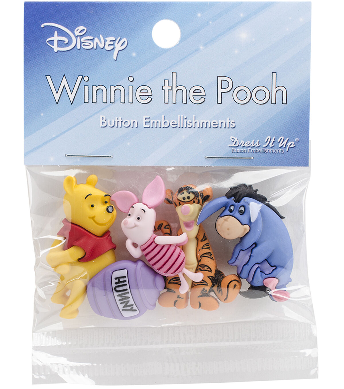 Silly old bear! Embellish all your favorite jackets, frames, woodcrafts, embroidery, and more with these Winnie The Pooh inspired craft embellishments. This pack includes Pooh, Piglet, Tiger, Eeyore, and a pot of delicious Honey.