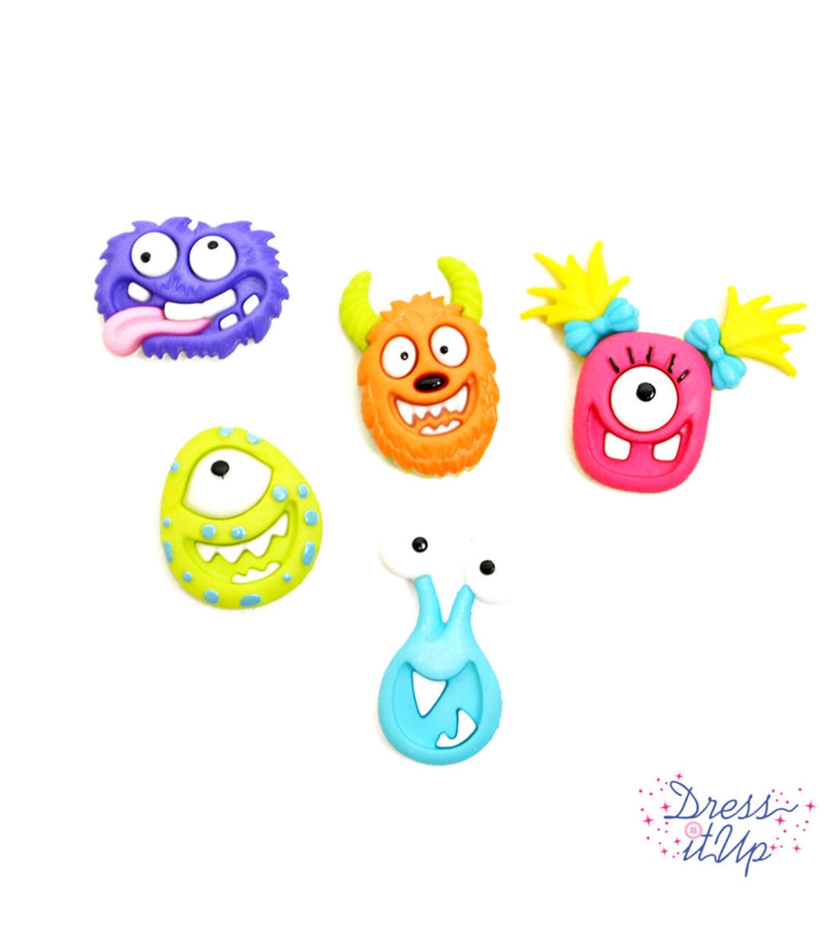 The Dress It Up Mad for Monsters Button Embellishments are just what you need to introduce your little monsters to button art. These resin buttons are shaped like monsters and sport bright hues. Your little ones can also use them to decorate Halloween crafts. They will also look great on dresses, tops, backpacks and hair accessories.
