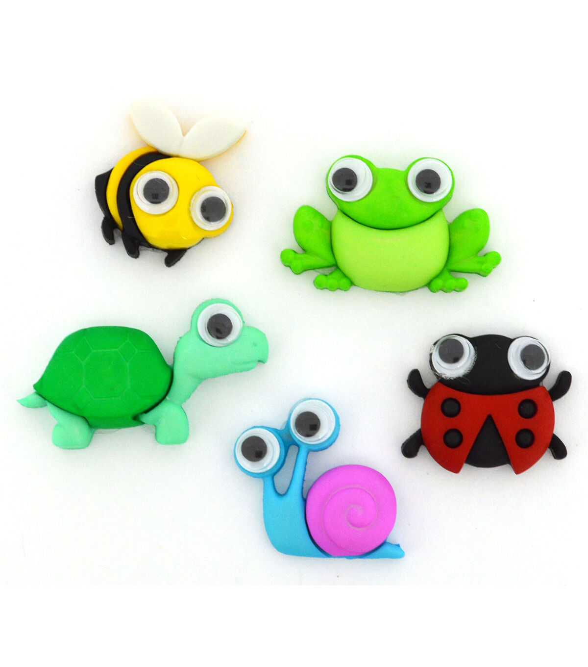 Add a wacky touch to your DIY craft and sewing projects with the Jesse James Dress It Up Nature Button Embellishments-Wild & Wacky. You can use them to lend a fun look to dresses, tops, tees, handbags, totes and more . These button embellishments are shaped as a tortoise, bee, frog, snail and a bug.