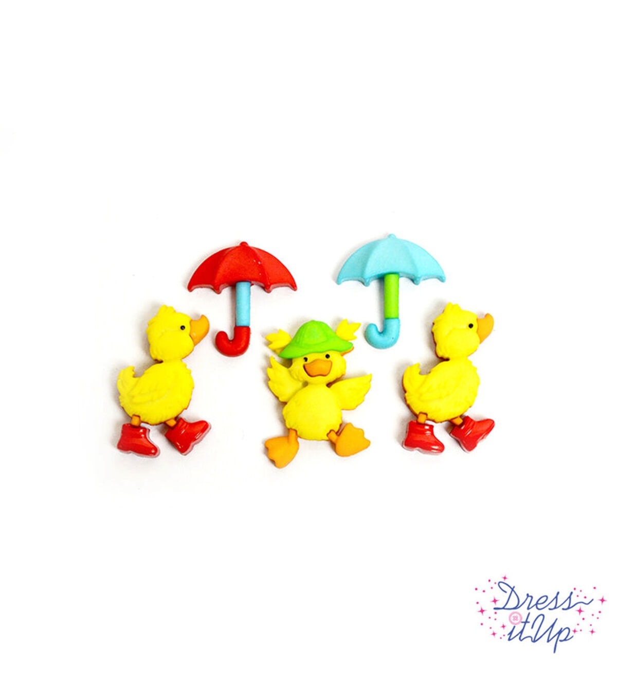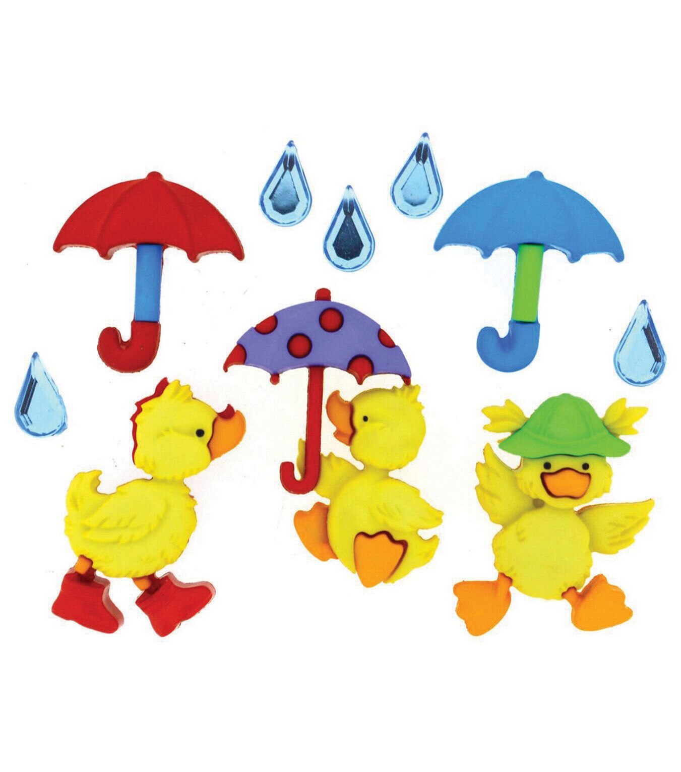 The adorable Puddle Jumpers are what you need to up the cuteness quotient of your sewing projects. This pack includes plastic resin buttons that resemble three ducks and two umbrellas. You can use them to embellish cards, corkboards, wood craft projects, scrapbooks, umbrellas and more.