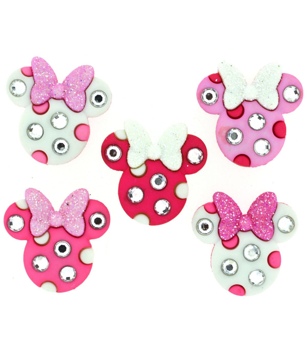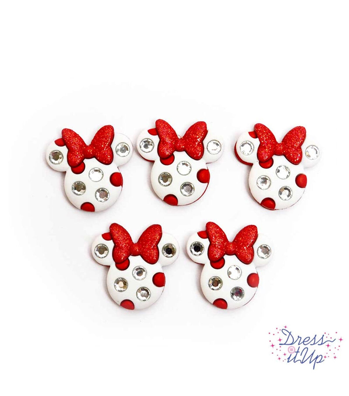 The adorable Dress It Up Disney Minnie Rhinestone Heads are perfect embellishment for the apparel of your Minnie Mouse fan. These twinkling buttons resemble Minnie Mouse heads adorned with rhinestones. They come with red-hued bows flaunting a glitter finish. You can also use them to adorn your little one's craft projects, tutus, picture frames, scrapbooks and more.