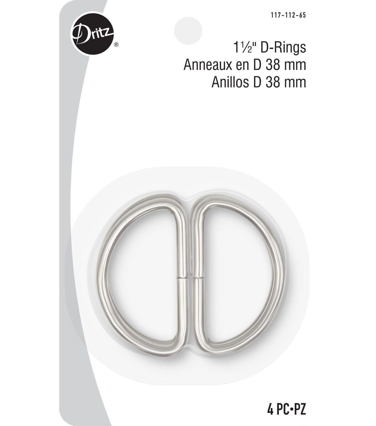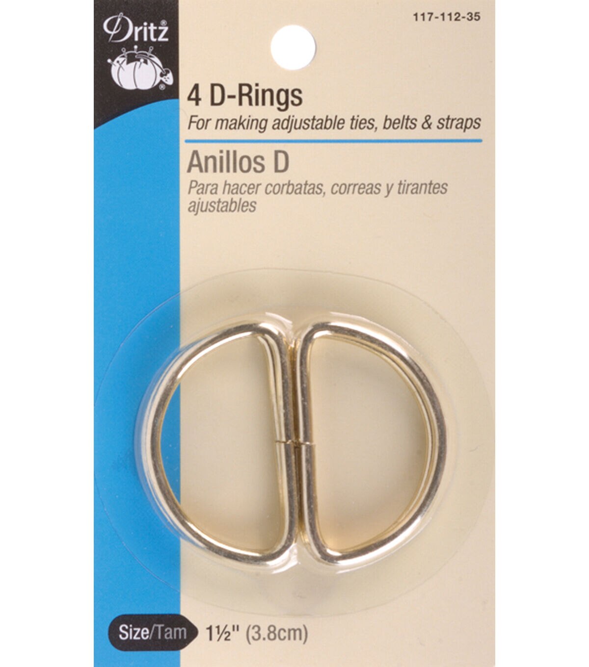 Update your sewing kit with the Dritz Metal D Rings 1.5'' Pack of 4. These metal D-rings can be used to make adjustable straps, ties and belts. You can also accessorize your overalls, totes, travel bags, backpacks, purses and lots of other creative handmade projects with these adjustable metal rings. This metal D-ring set is available in a variety of finishes, each sold separately.
