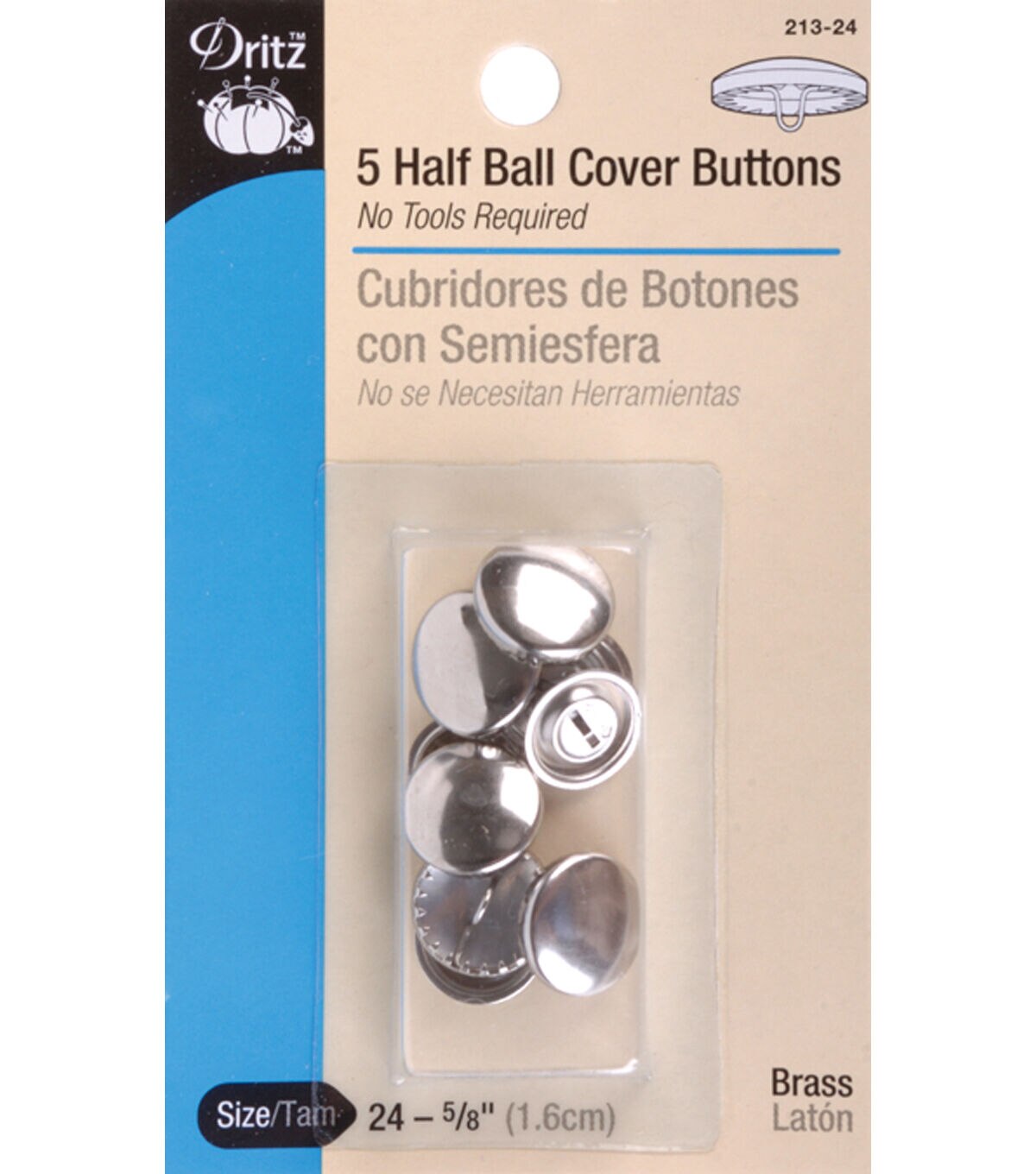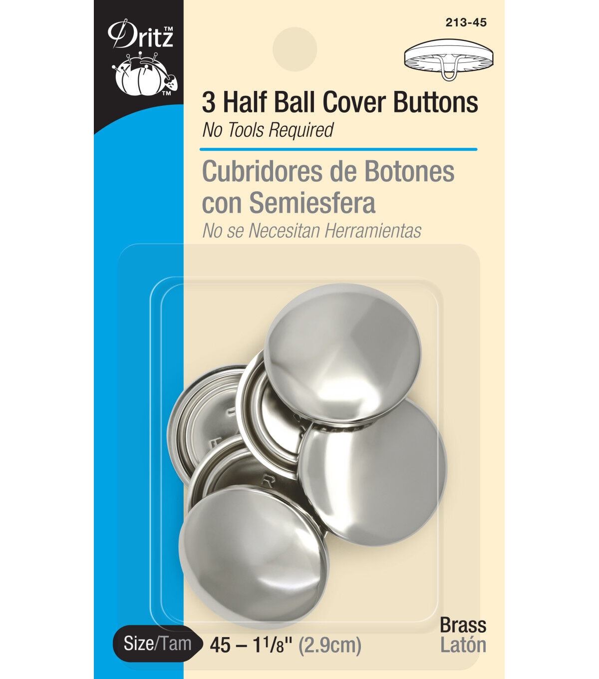 Create unique looks for your fabric projects with the Dritz 1-1/8'' Size 45 Half Ball Cover Buttons Brass Pack of 3. The pack contains three brass shells with shanks and back plates that can be covered with almost all types of fabrics. These half-ball cover buttons don't require any tools for assembly. Use them to add buttoned patterns to your jackets, sweaters, cardigans, tops, shirts and other garments. Available in different packs with varying sizes and quantity.