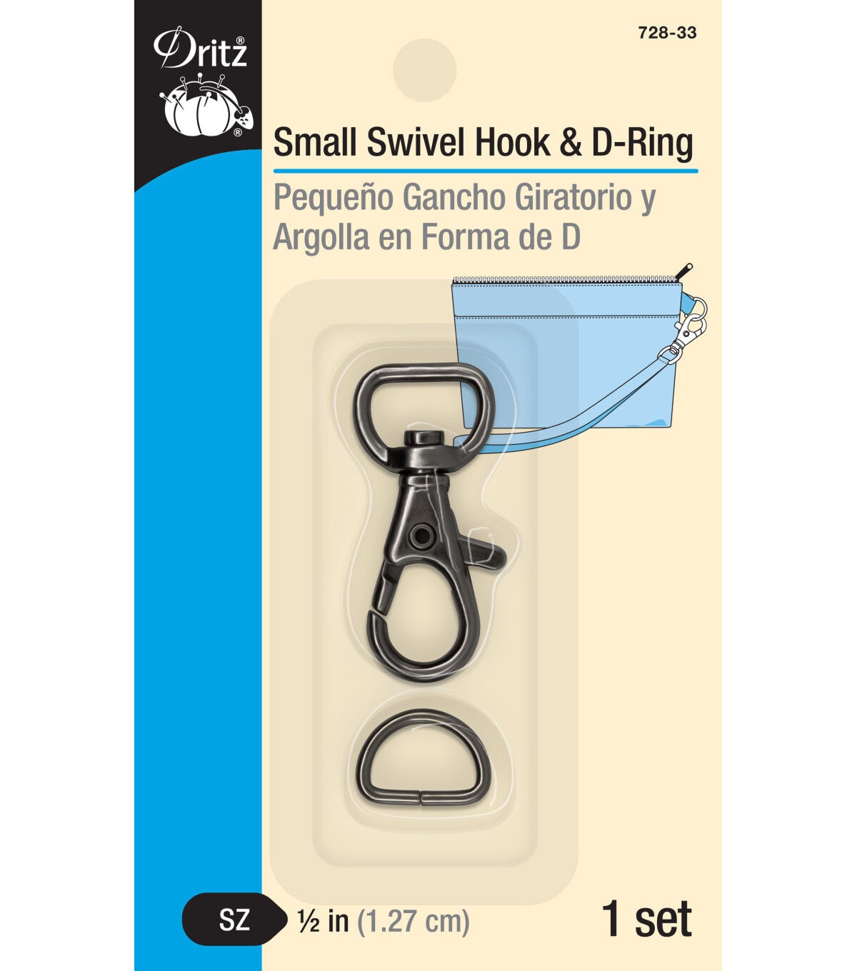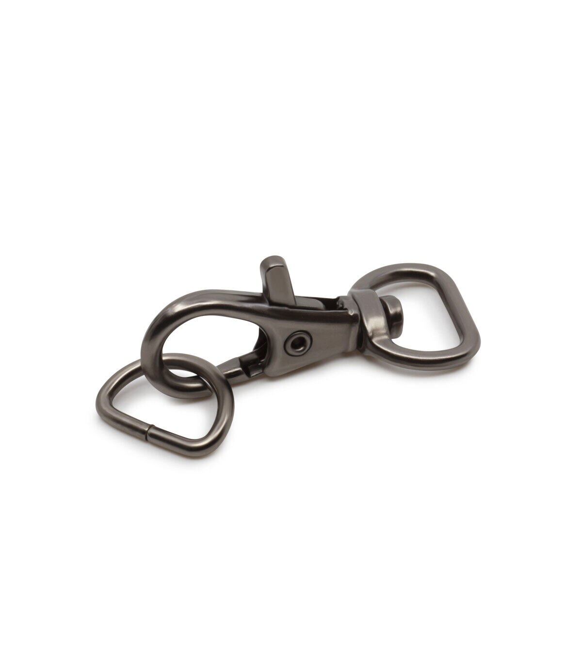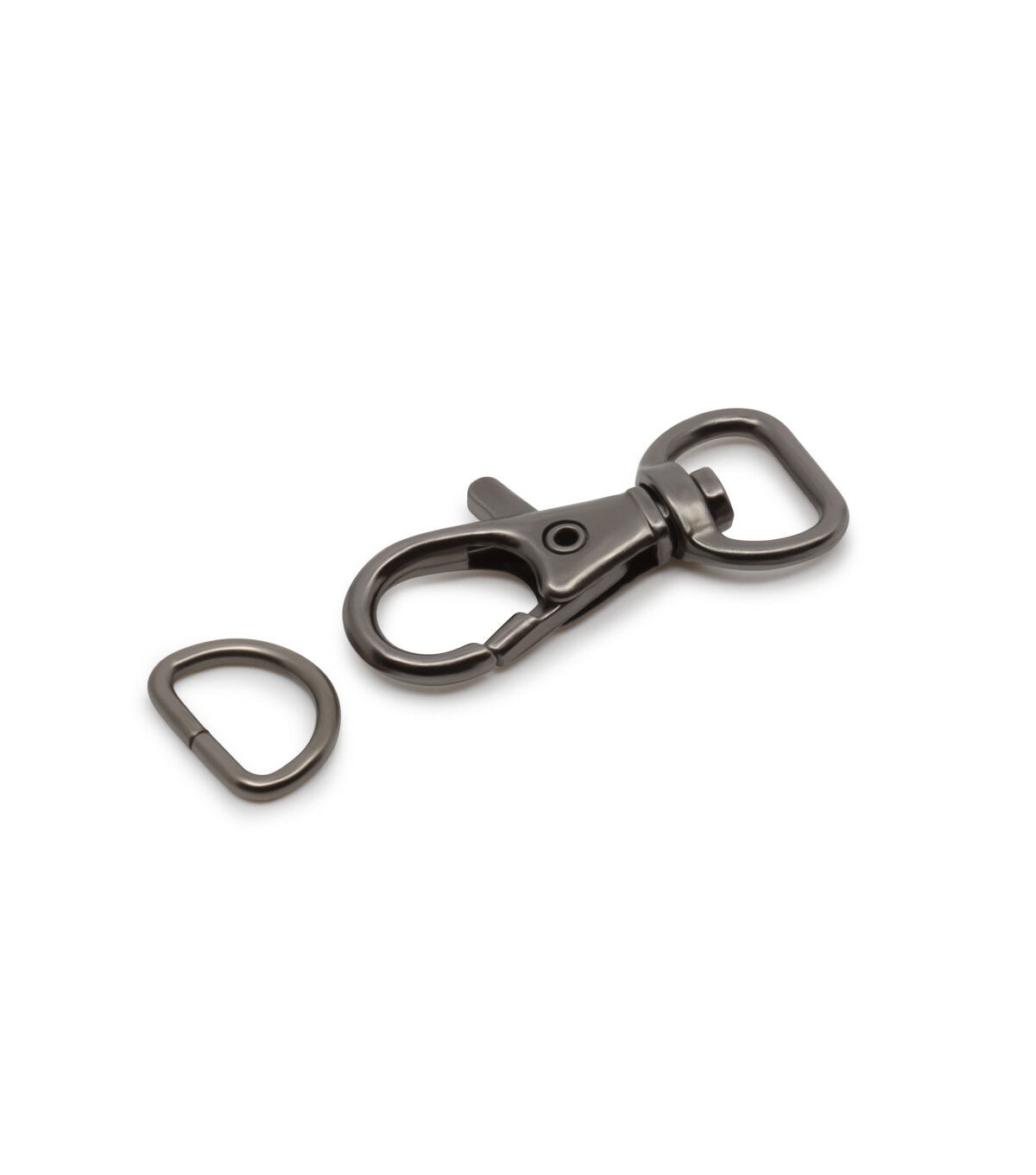 Complete your sewing supplies with the Dritz Small Swivel Hook & D-ring - Gunmetal. This D-ring, flaunting a gunmetal tone, is perfectly sized to use on the straps of wristlets and small clutches. It attaches to a small tab of fabric that extends from the side of the wristlet. The swivel hook is attached to the strap and connects to the D-ring. You can unhook the swivel hook when the strap is not required or desired.
