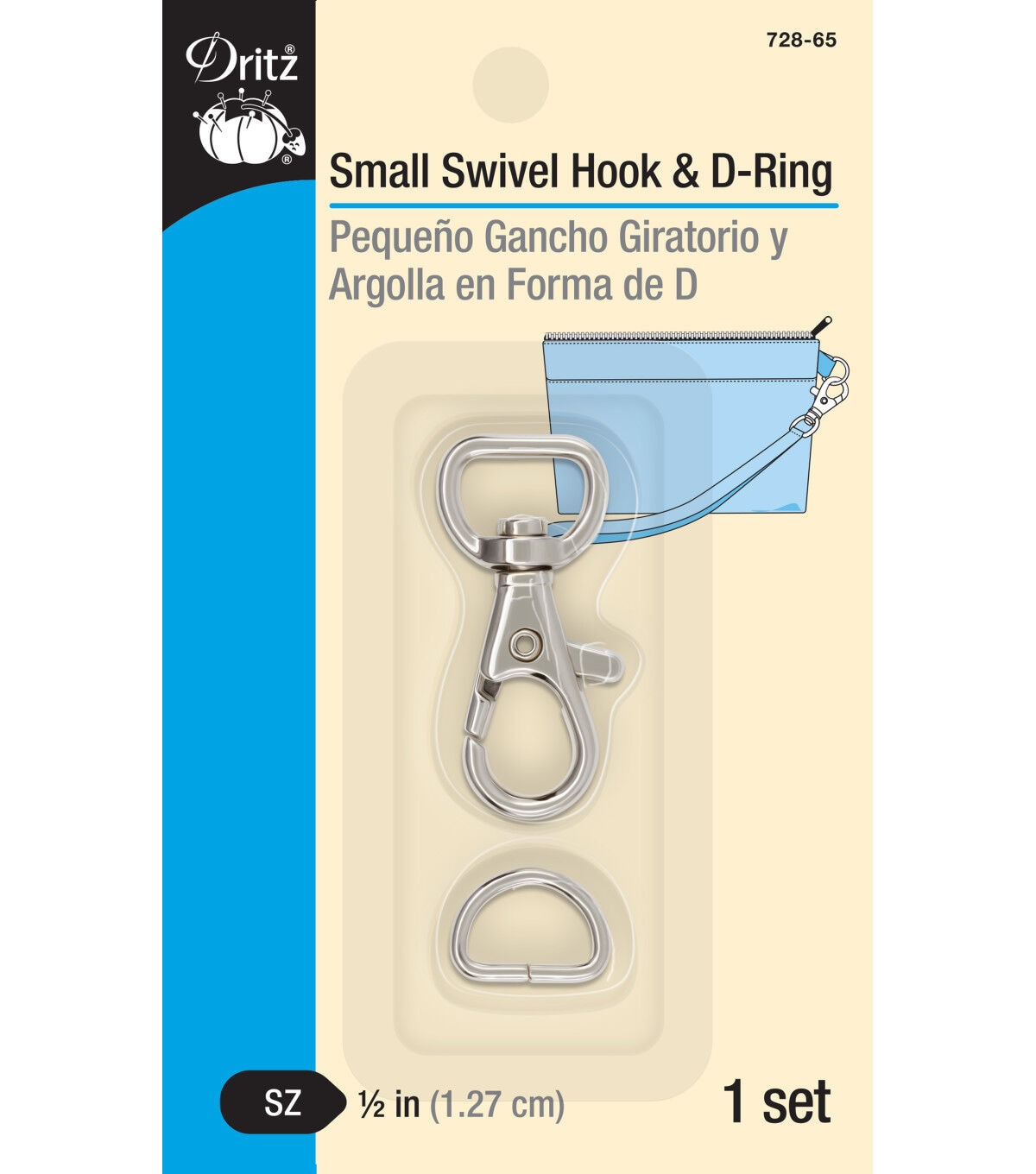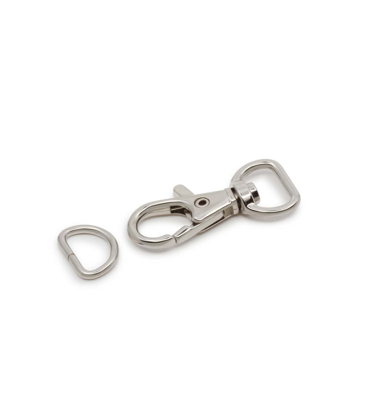 Complete your sewing supplies with the Dritz Small Swivel Hook & D-ring - Nickel. This D-ring, flaunting a nickel tone, is perfectly sized to use on the straps of wristlets and small clutches. It attaches to a small tab of fabric that extends from the side of the wristlet. The swivel hook is attached to the strap and connects to the D-ring. You can unhook the swivel hook when the strap is not required or desired.