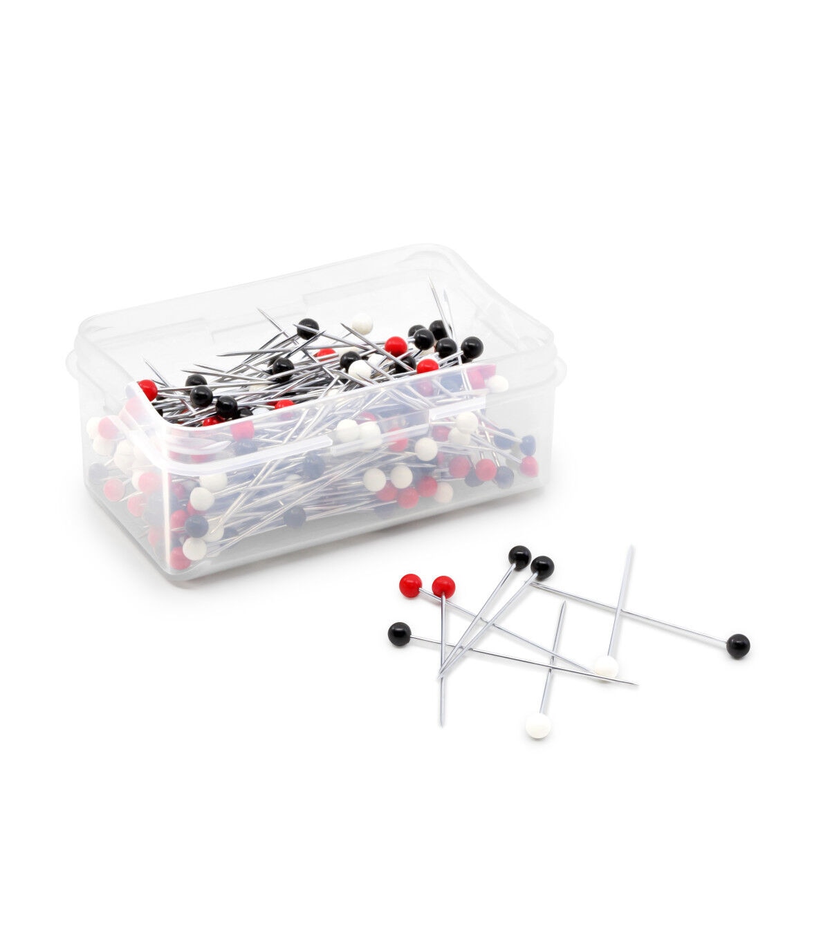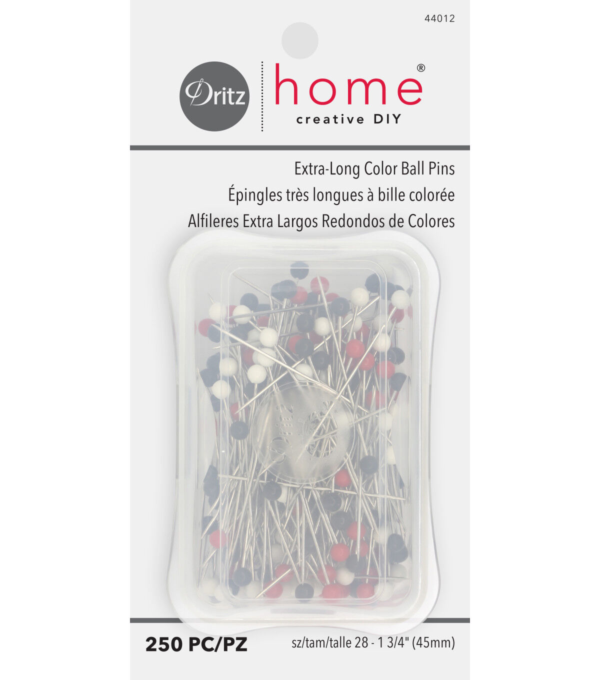 The Dritz Home Extra Long Ball Pins - Multi are a useful addition to your sewing basket. This pack includes pins with ball heads in light, medium and dark value colors in a reusable, see-through storage box. They can be used to penetrate fabric while you sew or hold pieces of your home decor project in place.