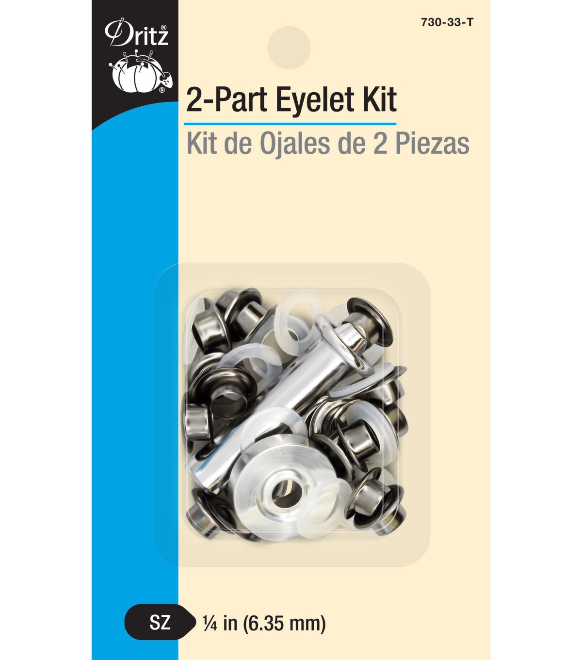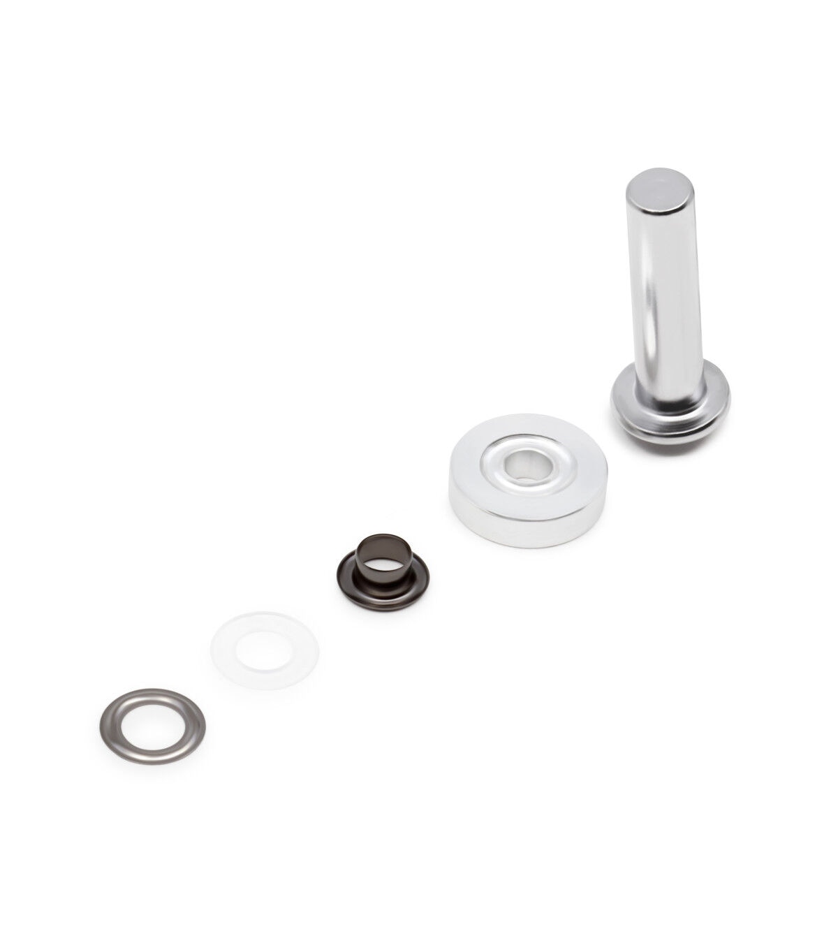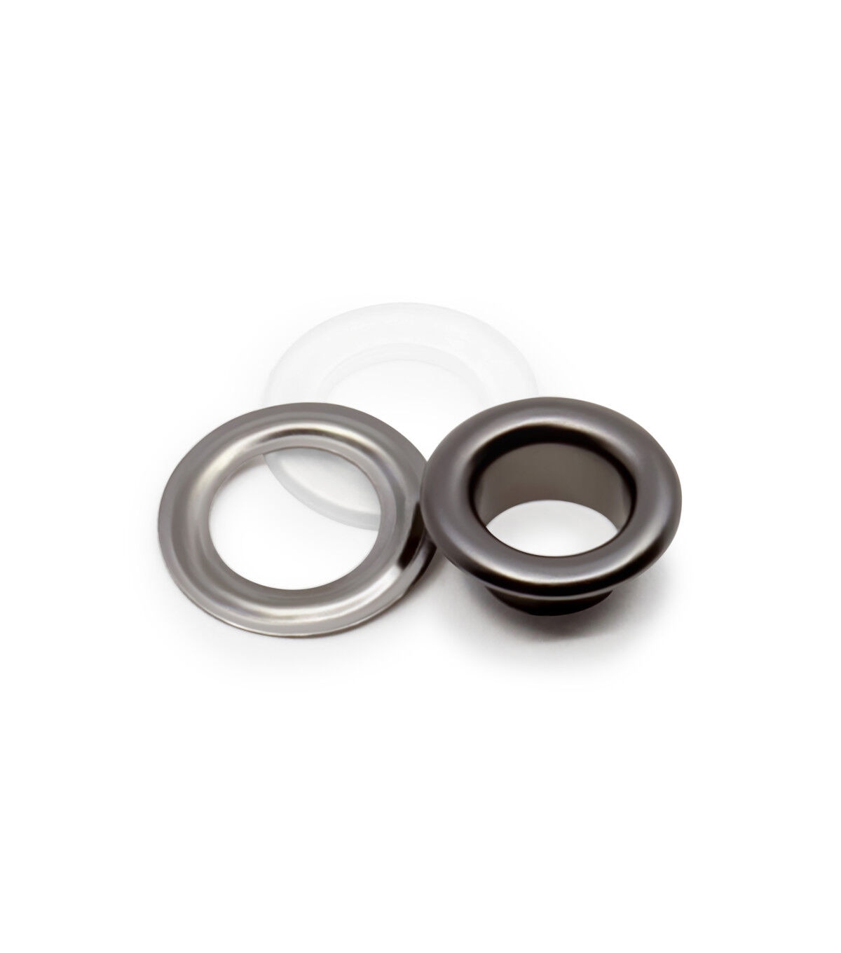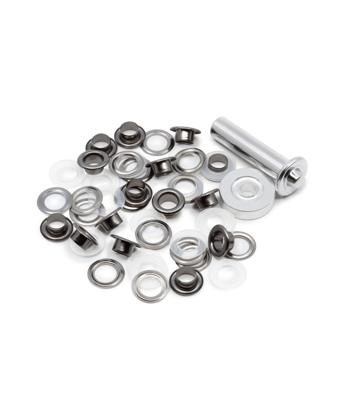 The Dritz 2-part Eyelet Kit - Gunmetal is sure to provide a professional finish and decorative detail to bags, purses and other craft projects. This kit includes eyelets that sport a gunmetal finish and hand tools for application. These eyelets come in the perfect size to create laced effects on garments and costumes. They are designed with a plastic insert placed on the post of the eyelet that needs to be added on the wrong side of the fabric for extra stability and support. A washer is placed over the insert and applied with hand tools and a hammer. You can use the smooth finished eyelets on fabric surfaces.