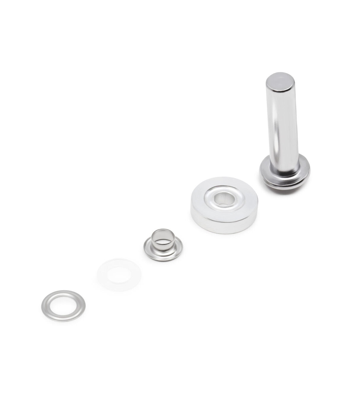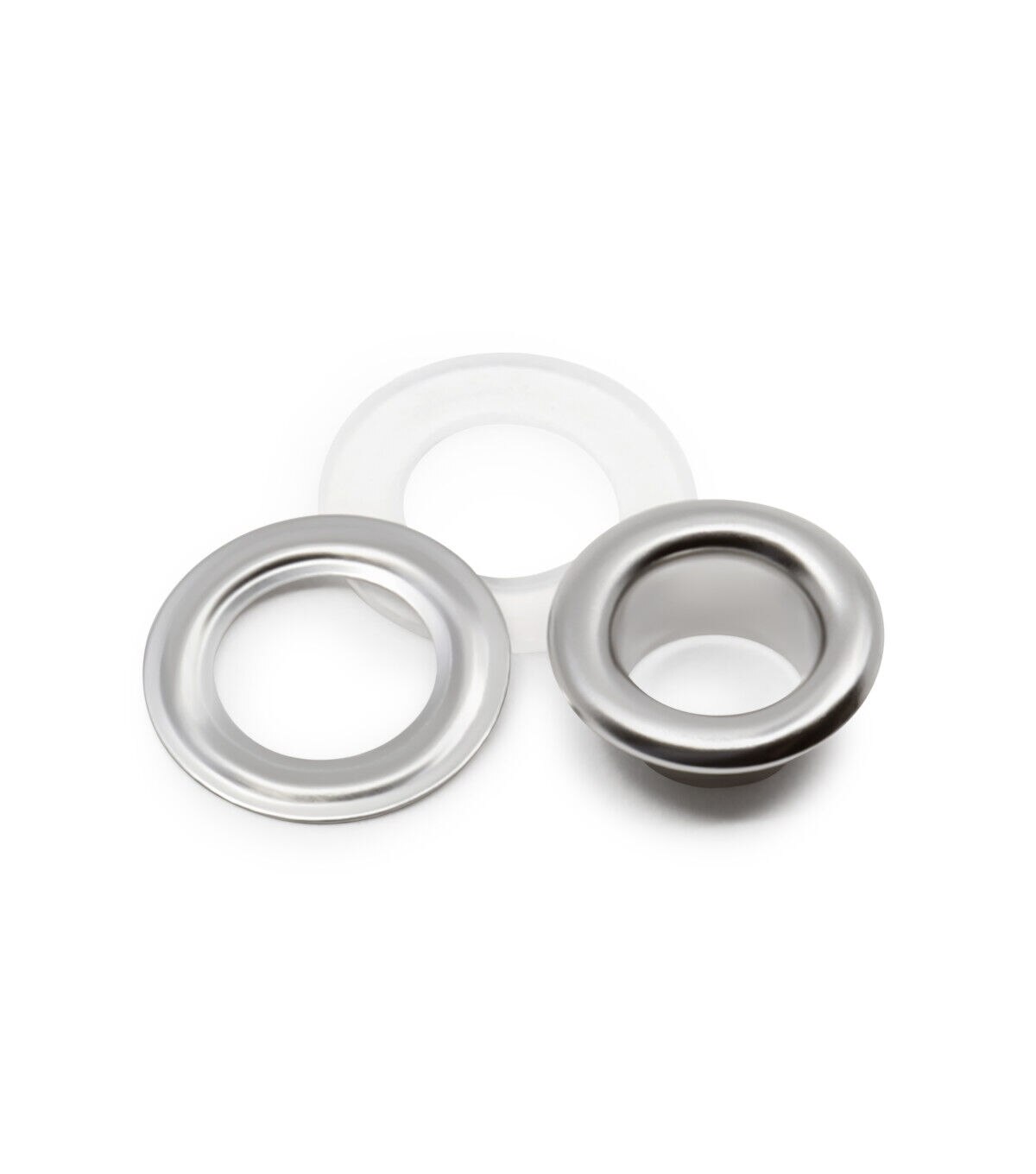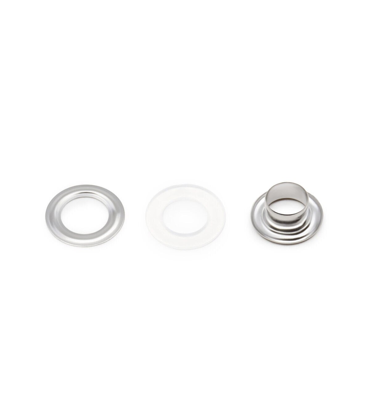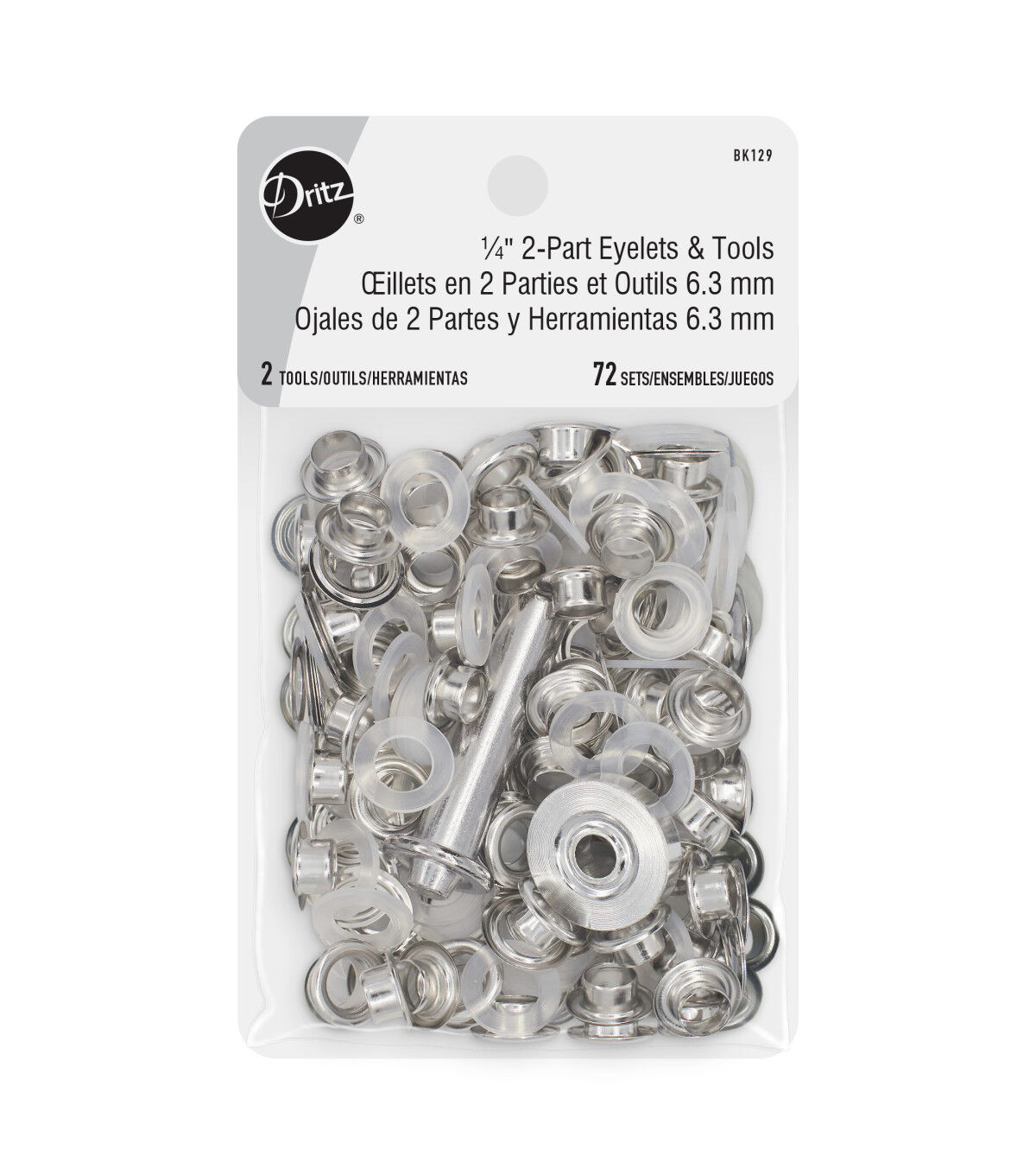 Provide a professional finish and decorative detail to garments, bags, purses and other craft projects using the Dritz 2-part Eyelets & Tools Set - Nickel. Perfectly sized, these eyelets can be used for creating laced effects on garments and costumes. They are designed with a plastic insert that is placed on the post of the eyelets on the wrong side of the fabric. The insert provides extra stability and support, making the eyelets suitable to use with only one layer of fabric. Use hand tools and a hammer to place the washer over the insert. This pack contains 72 eyelet sets and hand tools for application.