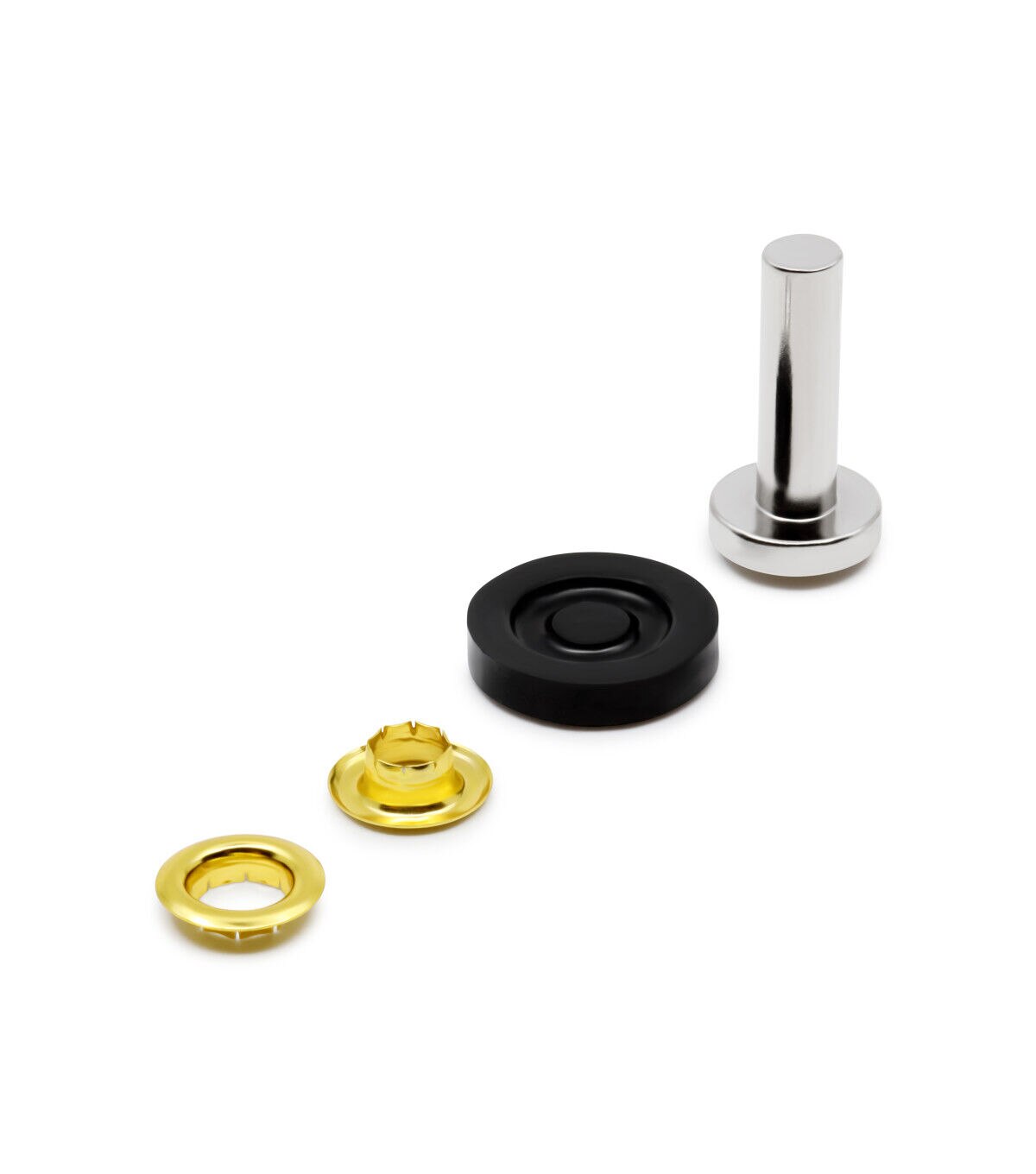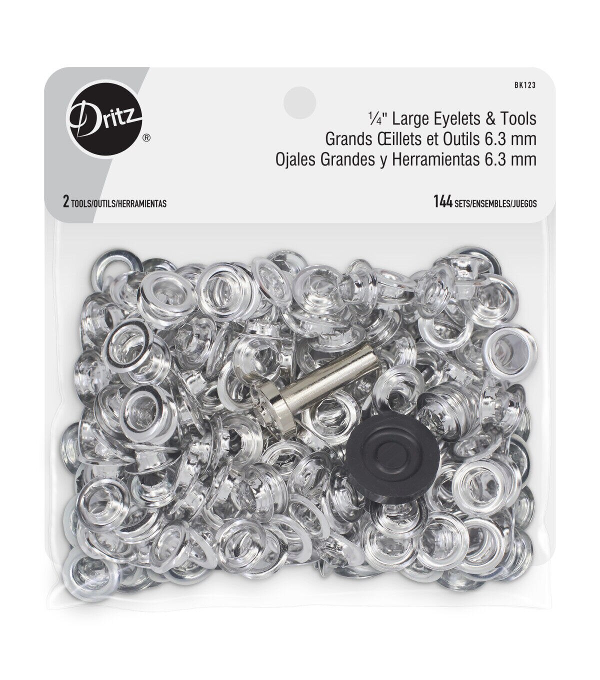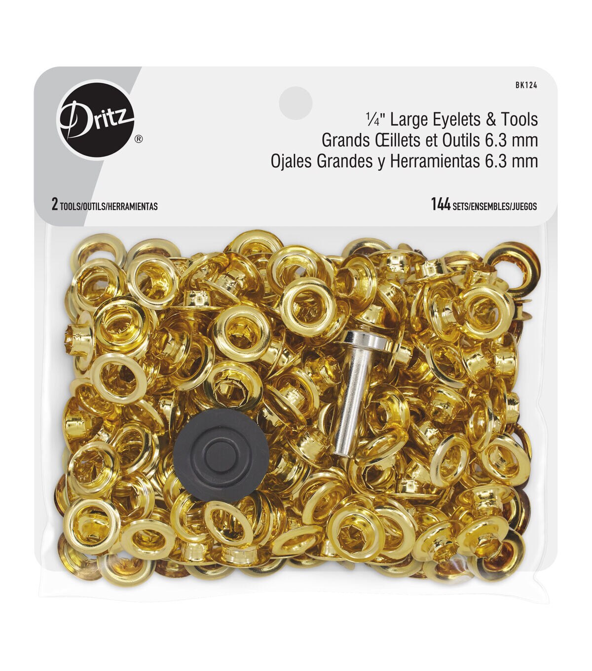 The Dritz Large Eyelets & Tools Set are a valuable addition to your sewing kit. This pack includes 144 sets of large eyelets and hand tools for application. These eyelets can be used for a variety of sewing or art and craft projects. Use them on belts, vests and jackets, or to create laced effects on your garments. You can even apply them to heavy paper as embellishments for your scrapbooks or handmade greeting cards.