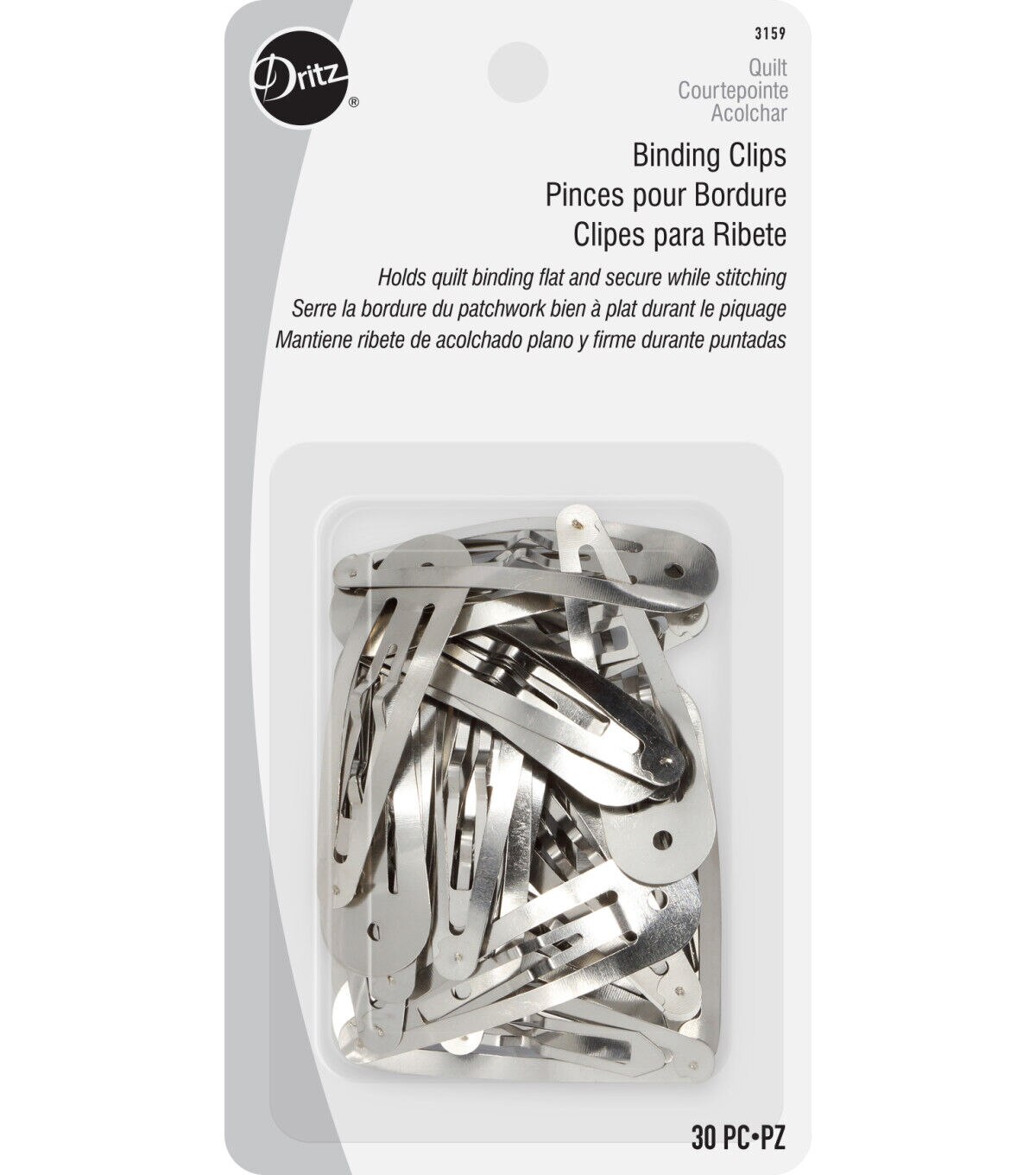 The Dritz Binding Clips - Silver are a must-have in any quilter's workshop. These useful clips are made of a flexible material and are designed with a convenient open and close mechanism. Simply snap them to hold the quilt binding securely in place and enjoy a smooth sewing experience. They are rustproof and retain their shine for a long time. This pack includes 30 snap clips measuring 1.87 inches.
