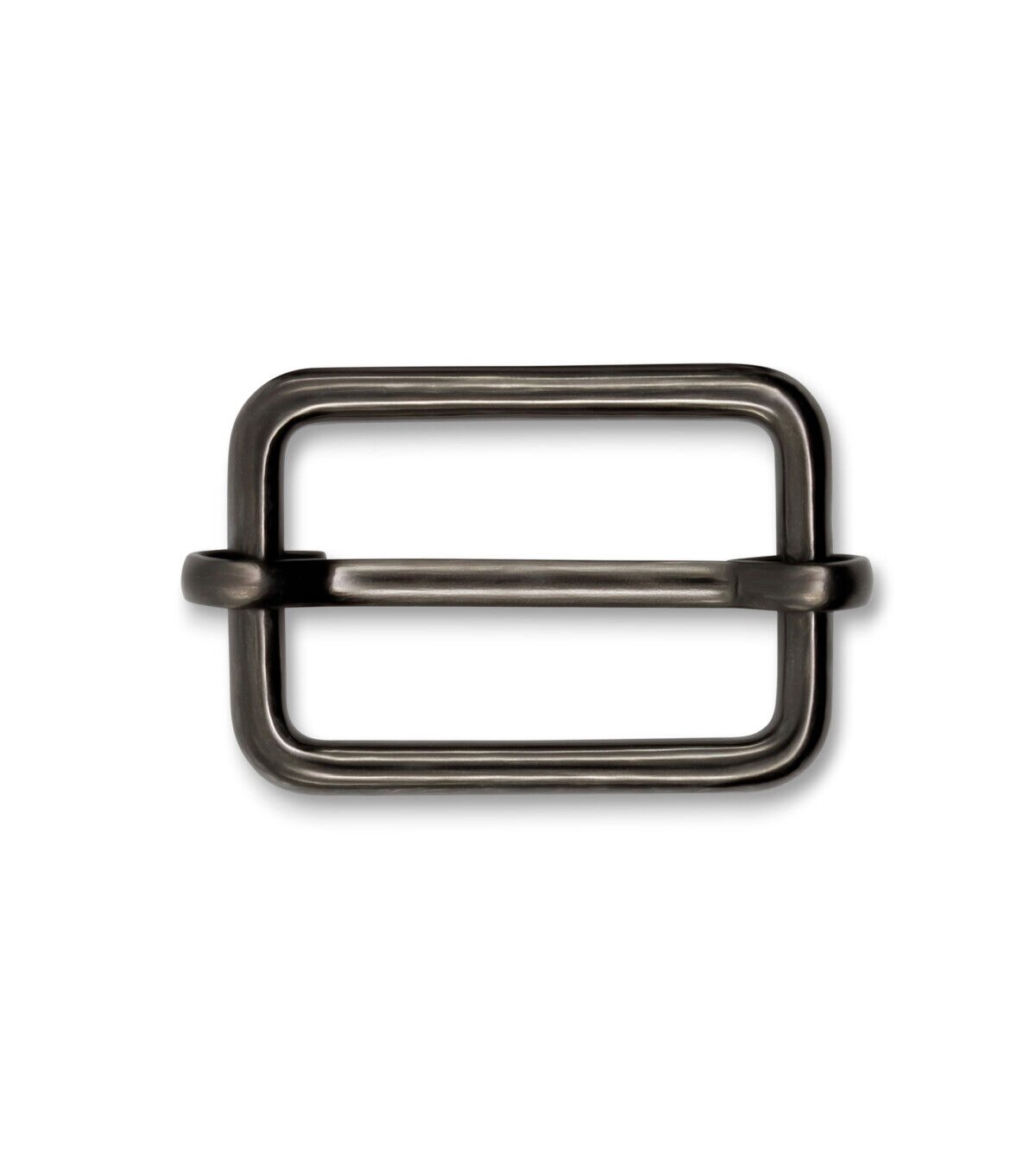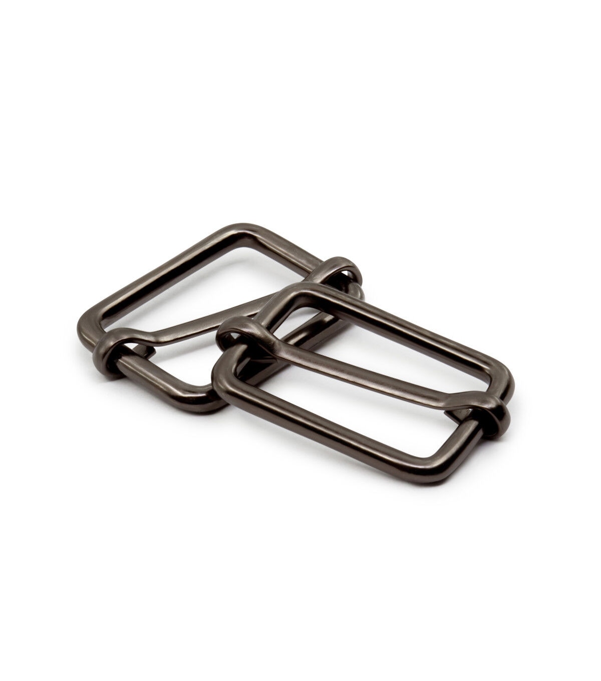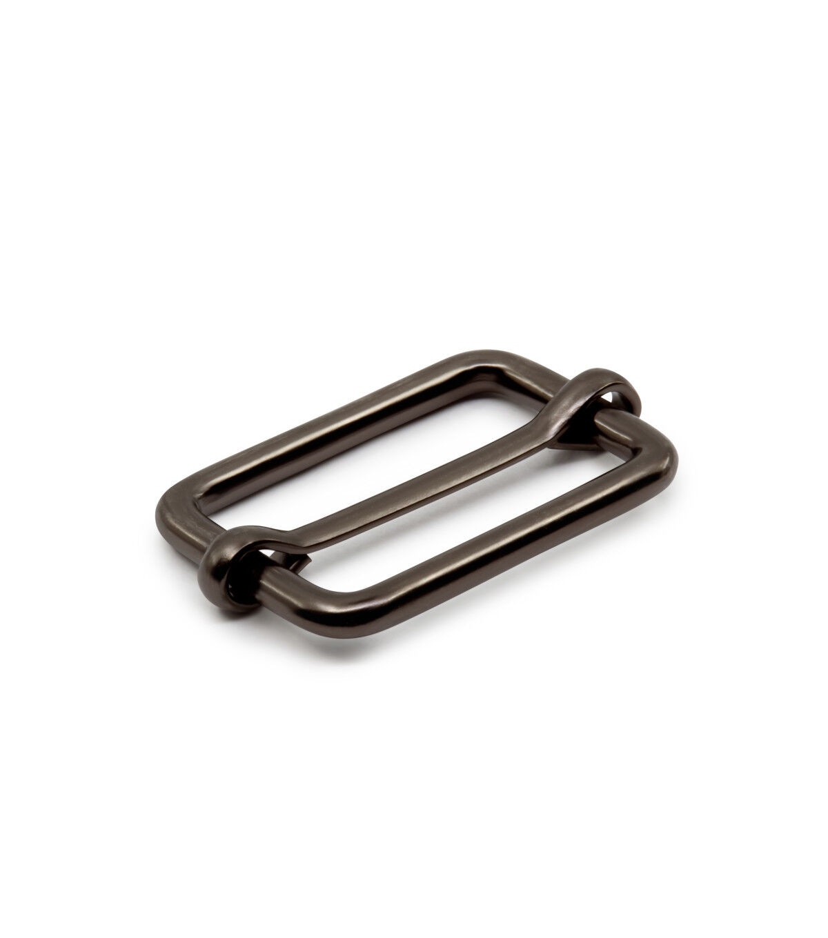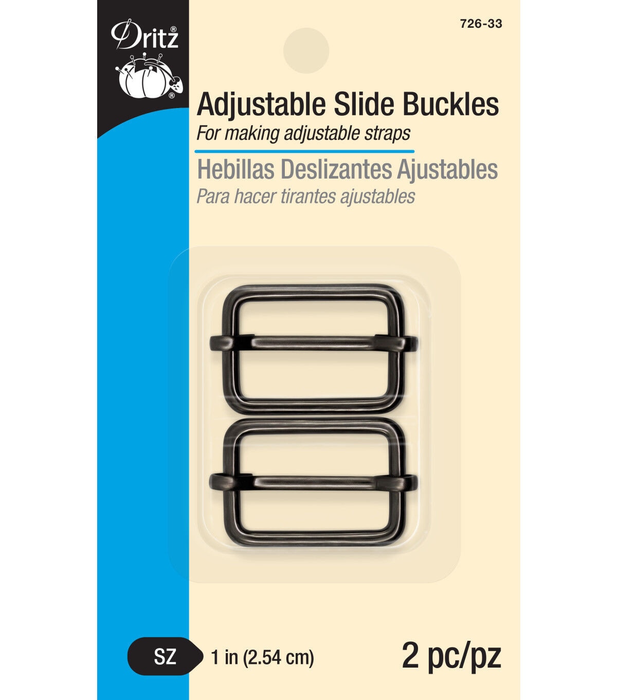 The Dritz Adjustable Slide Buckles - Gunmetal are a must-have for bag and purse construction. These buckles, sporting a gunmetal finish, are ideal to adjust straps and convert shoulder bags to cross-body bags. Make straps adjustable to any length using these buckles for a comfortable fit. They are rectangular and come with a moveable center bar that slides to one side and locks the strap fabric into place. You can also use them to create adjustable belts or straps on backpacks and luggage.