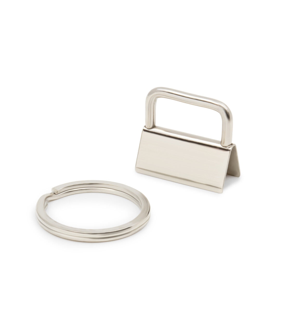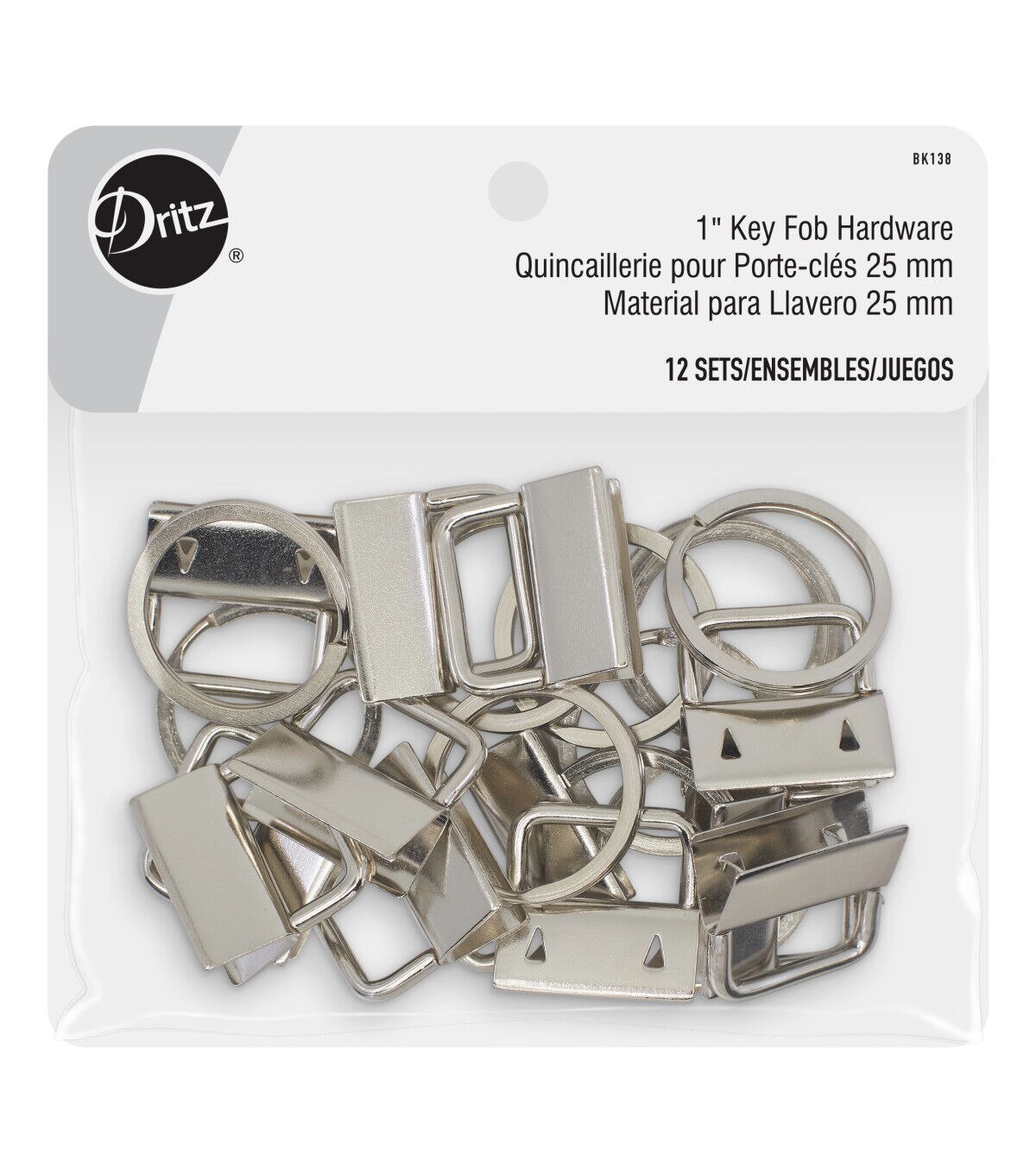 Team the Dritz Key Fob Hardware Sets - Nickel with belting, elastic or ribbon to create key fobs, lanyards or badges. These hardware sets are designed with a clamp and split ring and will accommodate a 1-inch strap. This pack includes hardware to make 12 fobs.