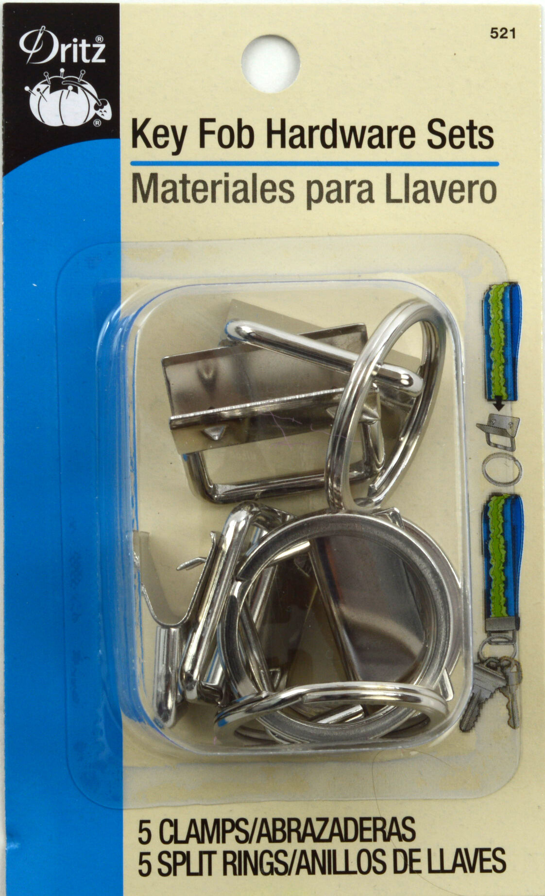 With the Dritz Nickel Key Fob Hardware Sets, you can create 1-inch key fobs by teaming them with belting, elastic or ribbon. This pack includes five nickel-plated clamps and five split rings. You can also make fashionable key chains, badges, lanyards and more with this set.