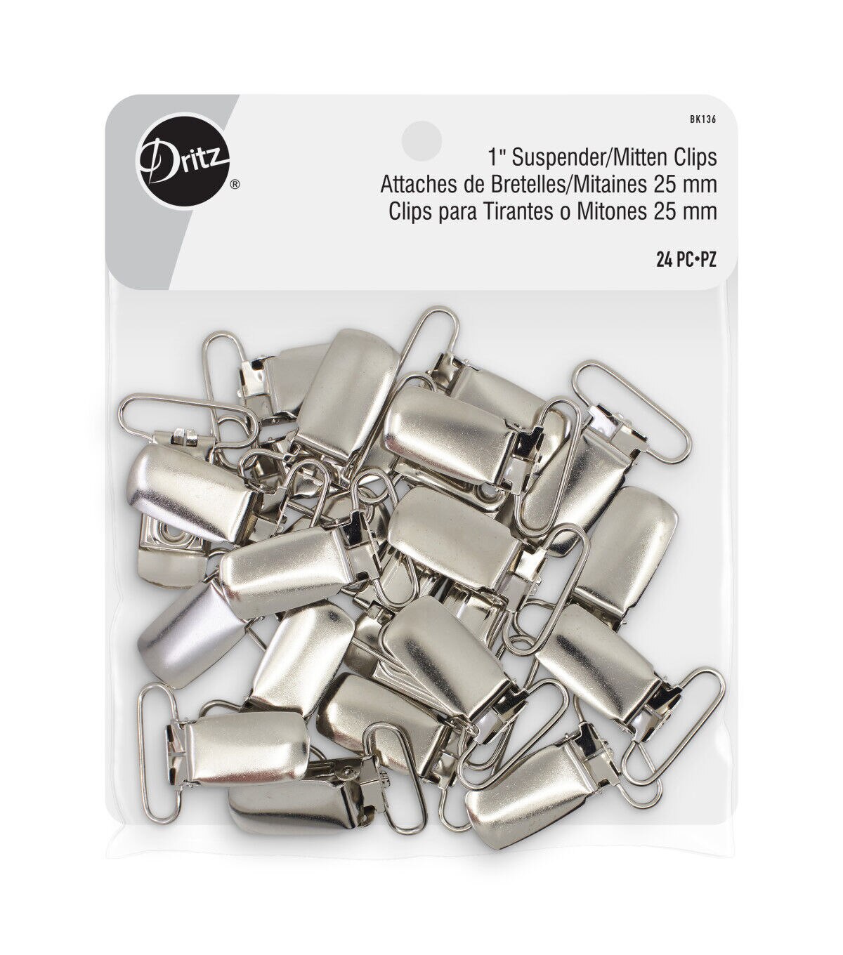 Keep garments securely fastened with the Dritz Suspender & Mitten Clips - Nickel. Use these clips to make your very own suspenders. They are ideal to attach mittens to coats or for pacifiers. You can cut your own fabric, slide it through the suspender clip, pin it, sew it and they are ready to use. These clips can also be looped around toys and teethers. They have a durable metal construction that lasts for years. This pack contains 24 clips.