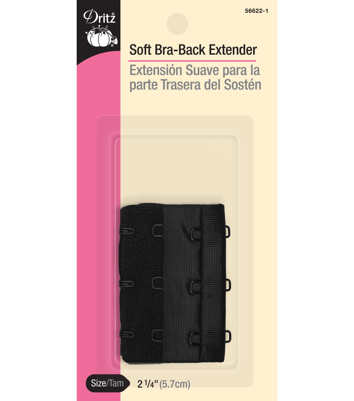 The Dritz Soft Bra-back Extender - Black is a better alternative to buttons. This black bra extender of 2.25 inches in width is designed with three hooks. It is easy to attach and easier to close. You can simply insert it between the bra hooks and eyes to add 1 to 3 inches to the bra hook. Choose from an assorted range of sizes, each sold separately to accommodate your needs.