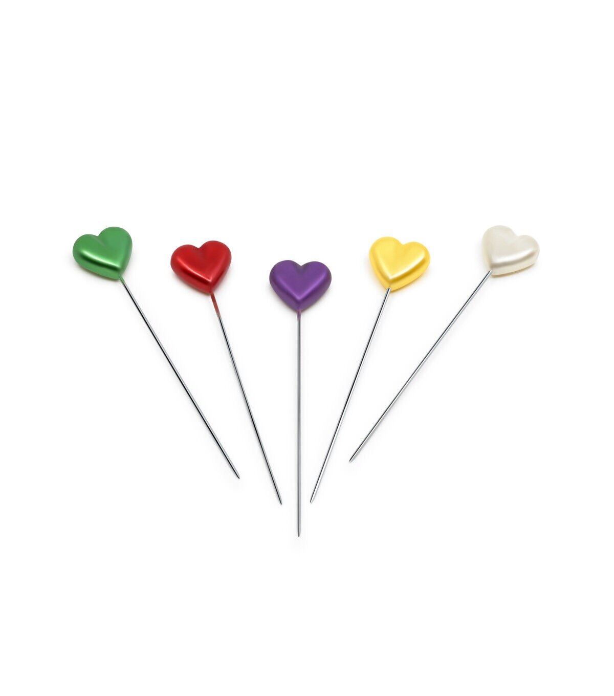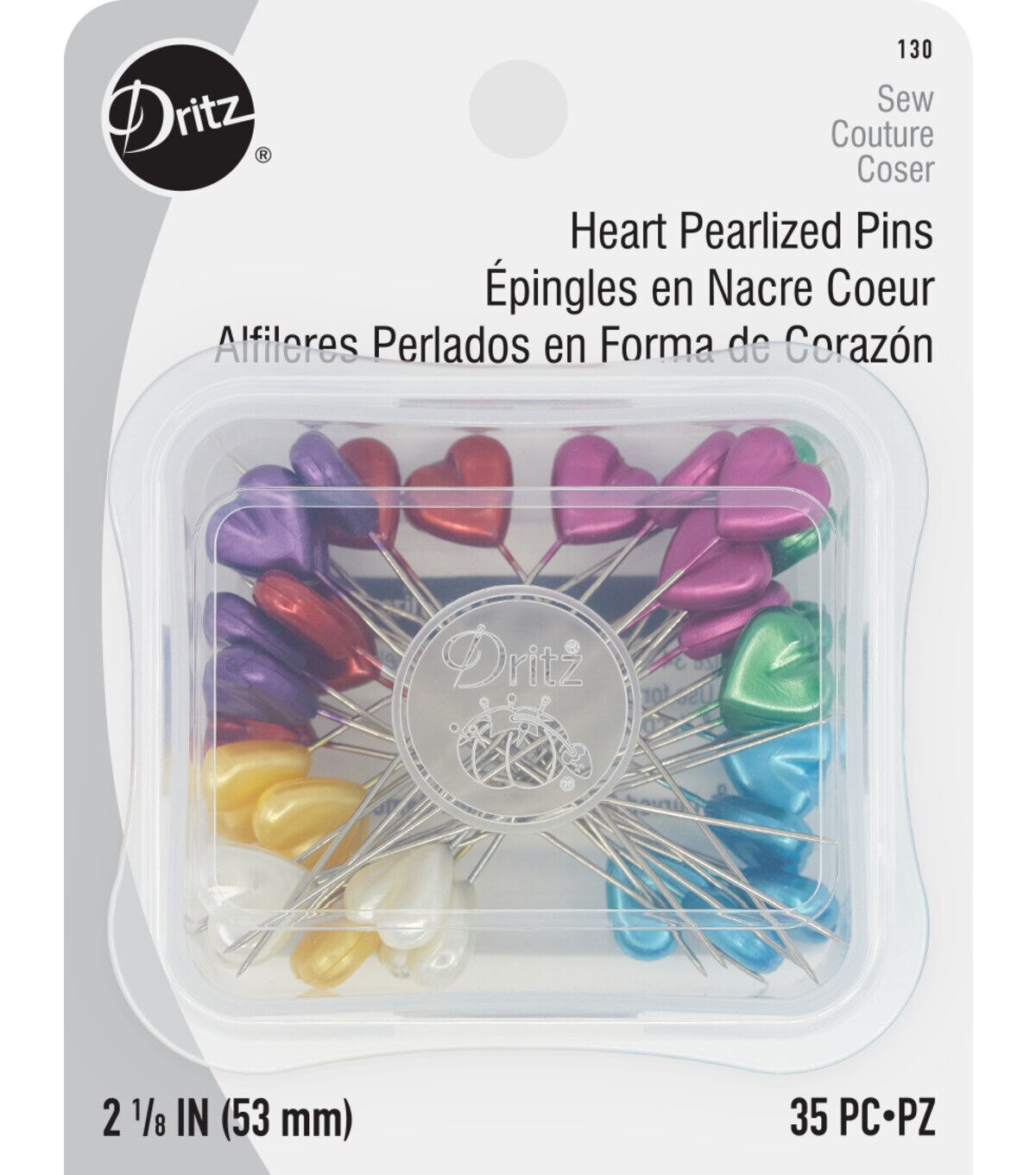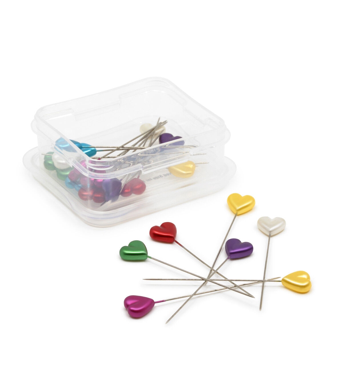 Use the Dritz Heart Pearlized Pins - Assorted for sewing tough fabrics like canvas and blocking knitted items. These pins are designed with heart-shaped heads sporting lovely shades with a pearlized finish. You can also use them for pinning slipcovers onto upholstery. This pack contains thirty-five heart pearlized pins of size 34 in a plastic storage box.