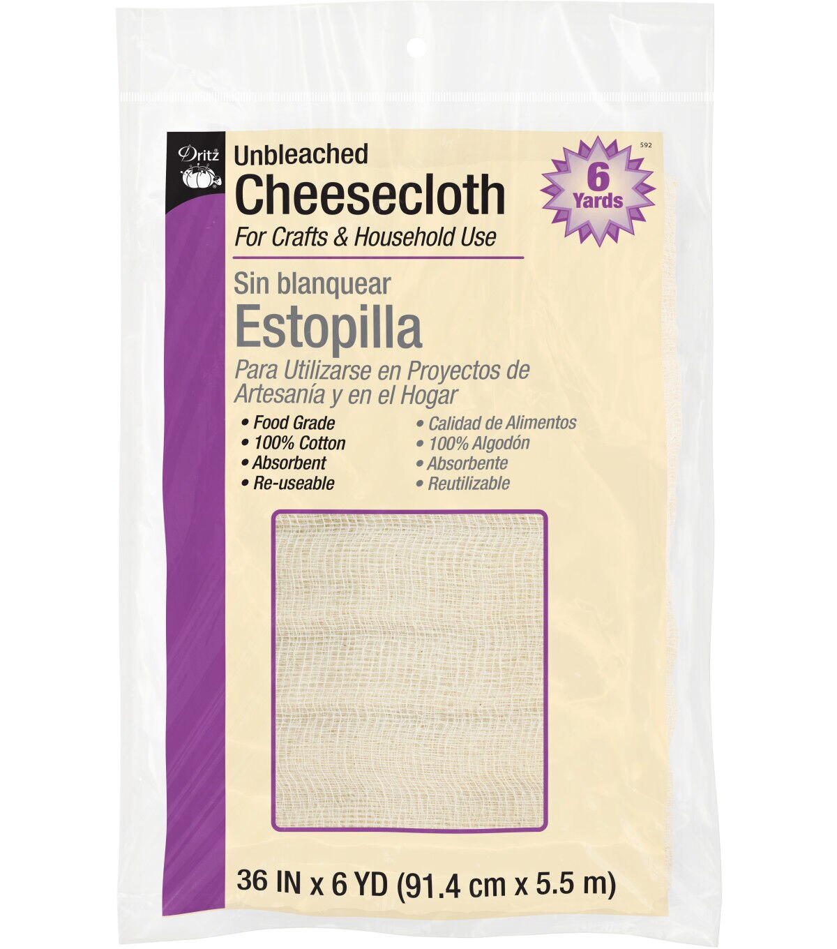The Dritz Cotton Unbleached Cheesecloth is a staple in any home. A naturally food-safe choice, this absorbent cheesecloth can be used for canning and cooking. Its thin, multiple layers of woven cotton make it ideal for cleaning and dusting as well as crafting, painting and staining projects. This pack contains 6 yards of 36-inch cheesecloth.