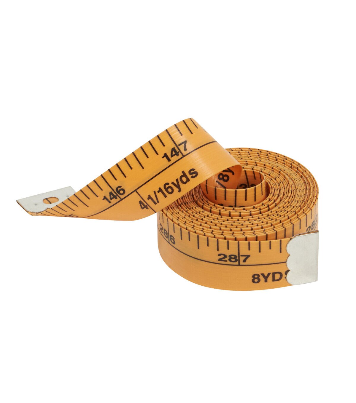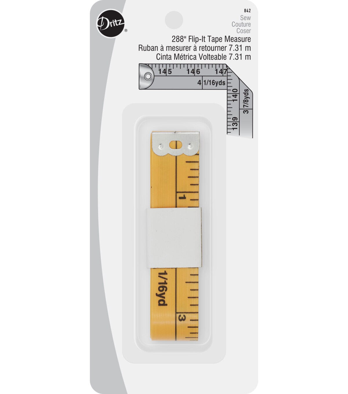 Add the Dritz Flip-it Measuring Tape - Yellow to your sewing kit. The clear and large markings on this yardage measuring tape let you do your work quickly and accurately. Use the front panel to measure up to 144 inches and turn it over onto the back to continue up to 288 inches. You can refer to the yardage marks on the tape when working on more popular fabric cuts.