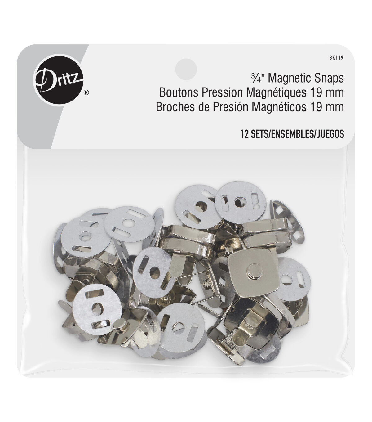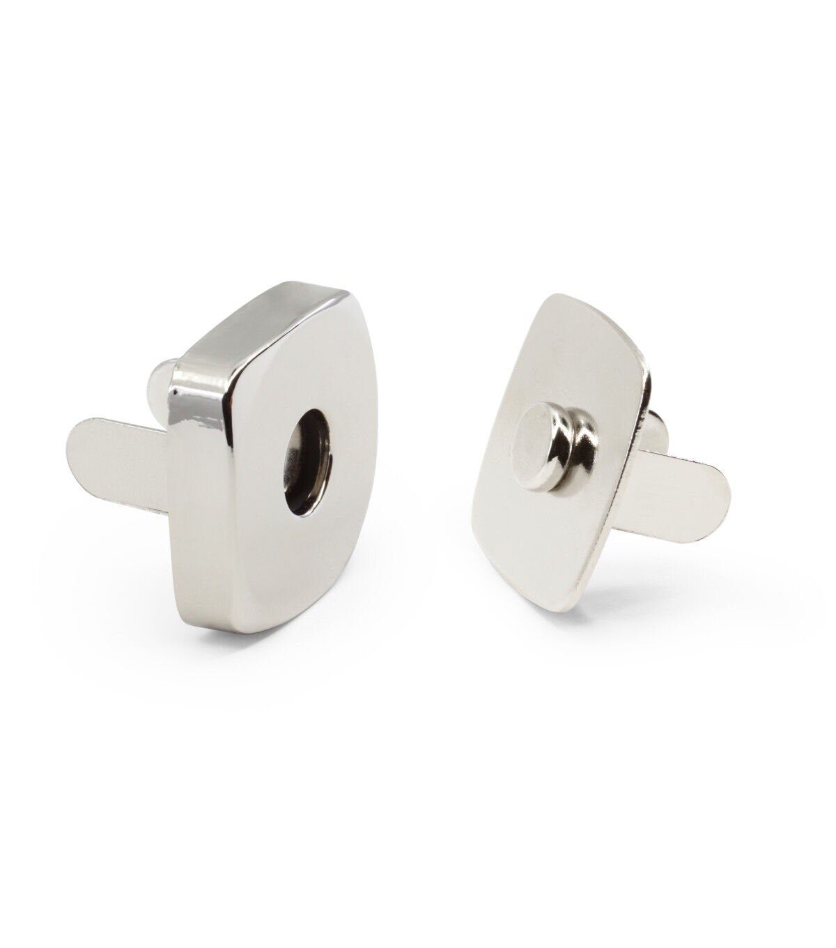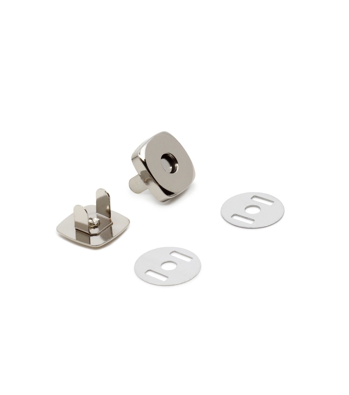 The Dritz Square Magnetic Snaps - Nickel are great to keep in your sewing supplies because of their versatility. They can be used as an addition to garments, pockets, purses, totes and backpacks. You can even use them on straps for books, albums, boxes and much more. This pack contains 12 sets of high-quality 0.75-inch nickel-toned, square magnetic snaps. These magnetic snaps are great for securing openings on apparel, purses, bags, totes and accessories and for securing flaps and pockets. All you need to do is cut the fabric, insert the prongs of snaps into the fabric, place the washer over the prongs and fold the fabric down to secure.