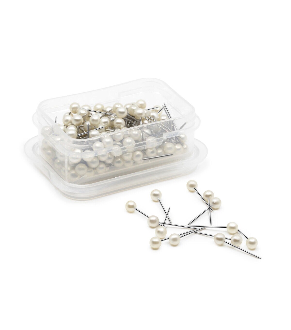 The Dritz Petite Pearlized Pins - White are perfect for hemming and more. This pack contains 150 pearlized pins in size 12. These pins come in a plastic storage box and are easy to store. You can also use them in papercrafting projects to keep paper patterns aligned, for securing laces and trims on your fabric creations and more.